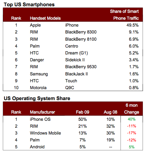 Après seulement 5 mois (sortie le 22 octobre 2008) de commercialisation du G1 / HTC Dream aux Etats-Unis, ce premier smartphone sous Android a déjà plus de 5% du trafic Internet des smartphones aux US (l’étude a même été réalisée lorsque le G1 n’avait que 3 mois de commercialisation). Ce qui est impressionnant c’est aussi les 50% de l’iPhone, et la baisse de tout les autres acteurs du marché des smartphones dont -11% pour RIM, -17% pour Windows Mobile et -12% pour Palm.