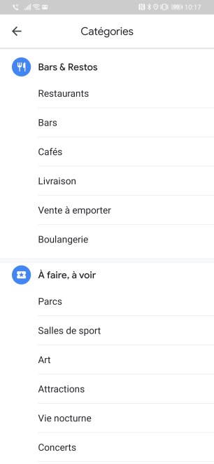 Il s’agit en vérité de raccourcis vers des recherches courantes, qui sont tout de même bien pratiques à avoir. Au clic, vous retrouverez une liste des adresses reconnues autour de vous pour chaque activité, tandis que « Plus » vous amènera à une liste catégorisée des différentes activités proposées par le service.