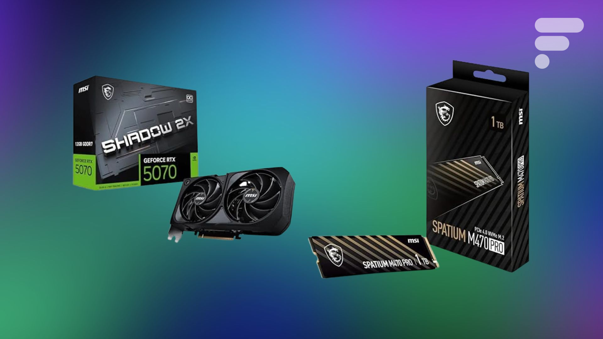 Dans ce pack proposé par Amazon, vous avez deux produits de qualité : le premier est une carte graphique, indispensable dans toute configuration gaming qui se respecte. Ce n’est pas n’importe laquelle, il s’agit d’une MSI GeForce RTX 5070 12 Shadow 2X OC pour faire tourner de nombreux jeux récents. Et un SSD M470 Pro de 1 To, au format M.2, aussi bien compatible avec votre PC que votre PlayStation 5, à condition de lui ajouter un dissipateur thermique, indispensable pour la console de Sony. Le tout pour 619 euros alors que c’est le prix de la carte graphique seule, et encore, quand elle est en promotion.