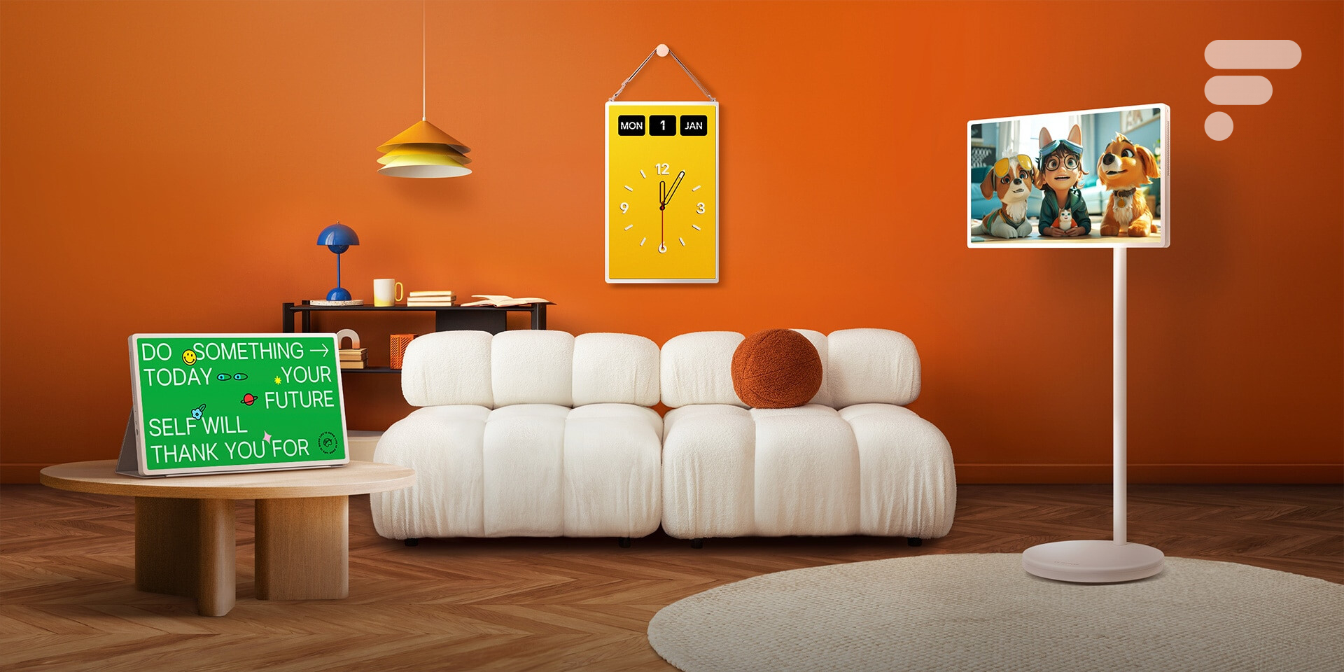 LG accompagne son StanbyME 2 de trois accessoires bien pensés : une bandoulière pour le transporter ou l’accrocher comme un tableau connecté, un étui folio façon tablette pour protéger et caler l’écran, et un support mural qui transforme l’appareil en affiche numérique fixe, il ne manque plus que la valise comme le StandbyME Go. Au CES, la marque a même poussé le concept en l’utilisant comme menu digital de restaurant.