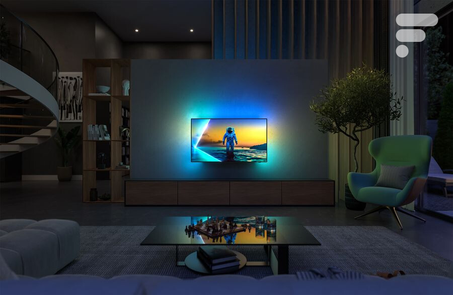 - Immersion lumineuse signée Ambilight, sur trois côtés, fluide et calibrée.