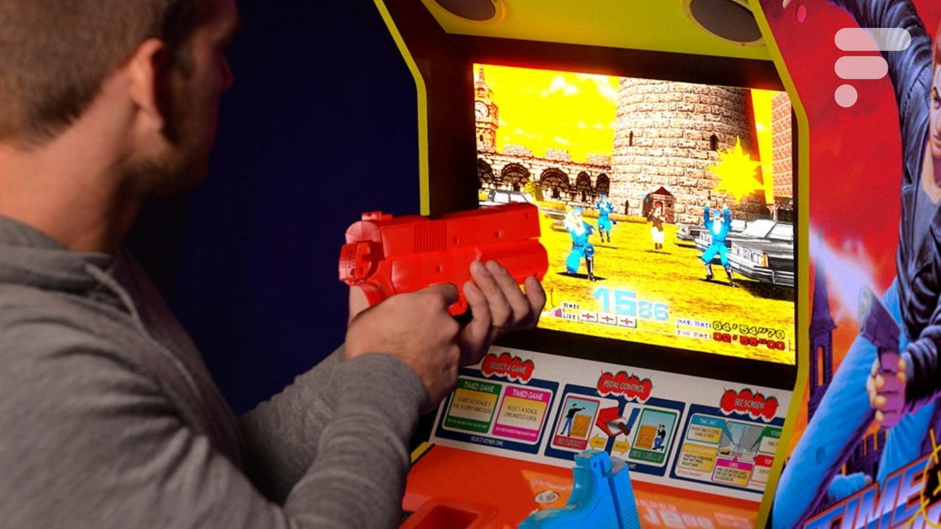 Sur cette borne d’arcade, vous retrouvez donc les deux guns rangés dans leur emplacement, un rouge et un bleu, avec le jeu original affiché sur un écran LCD de 17 pouces bien précis, ce qui est primordial pour Time Crisis. Les pistolets ont un recul à glissière qui simule un rechargement authentique, ce qui renforce l’immersion. Ce recul est désactivable sur les autres jeux si vous souhaitez plus de précision.