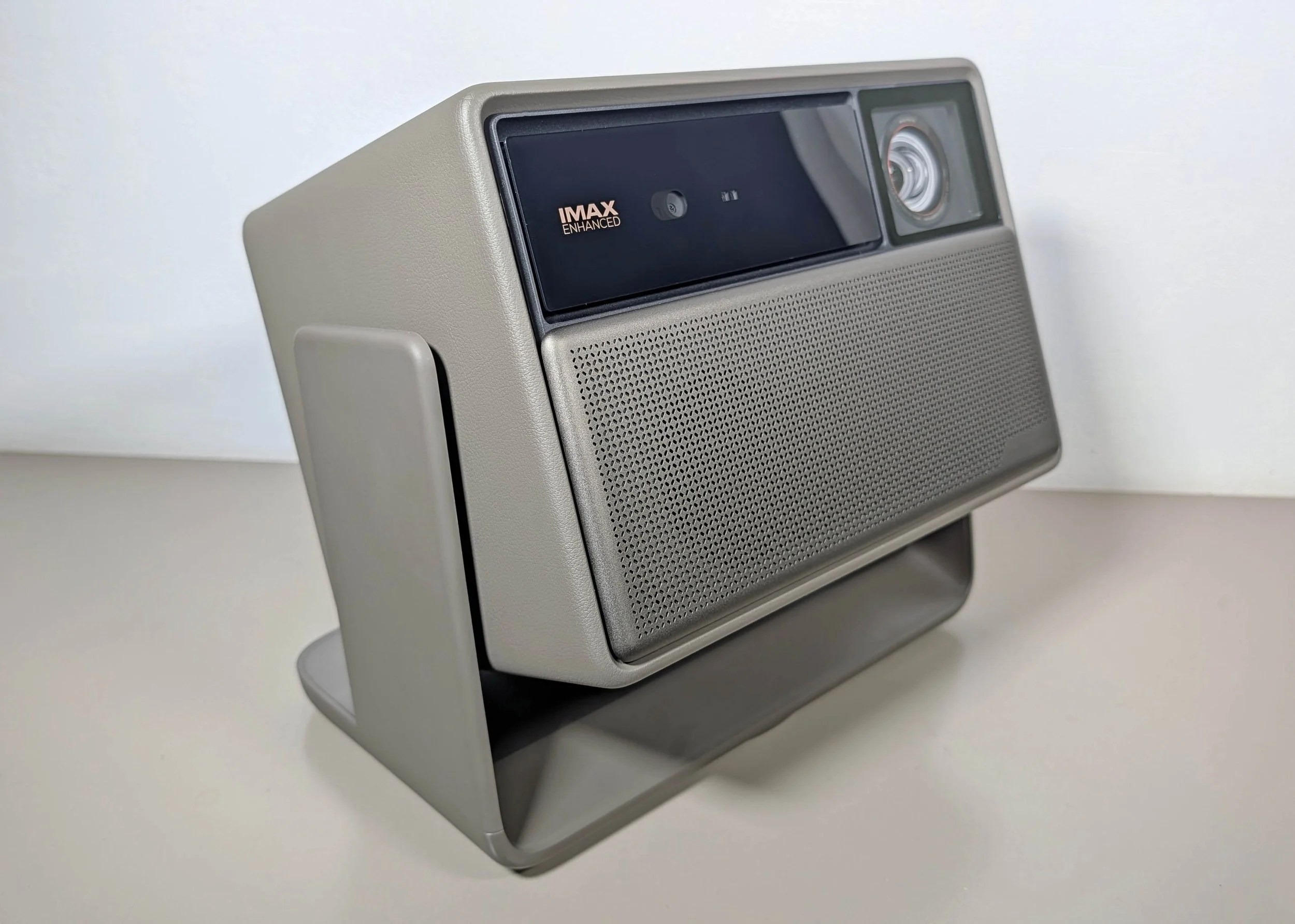 Le Xgimi Horizon 20, tout comme les modèles Pro et Max, est un vidéoprojecteur plutôt imposant (29,8 x 24,9 x 19 cm), mais qui ne manque pas d’élégance avec sa teinte bronze, ses angles marqués et ses lignes épurées. Le gros point fort de son design, c’est évidemment cette balancelle, qui lui permet de s’incliner vers le haut ou vers le bas. Un support pivotant est même présent pour une rotation sur 360°.