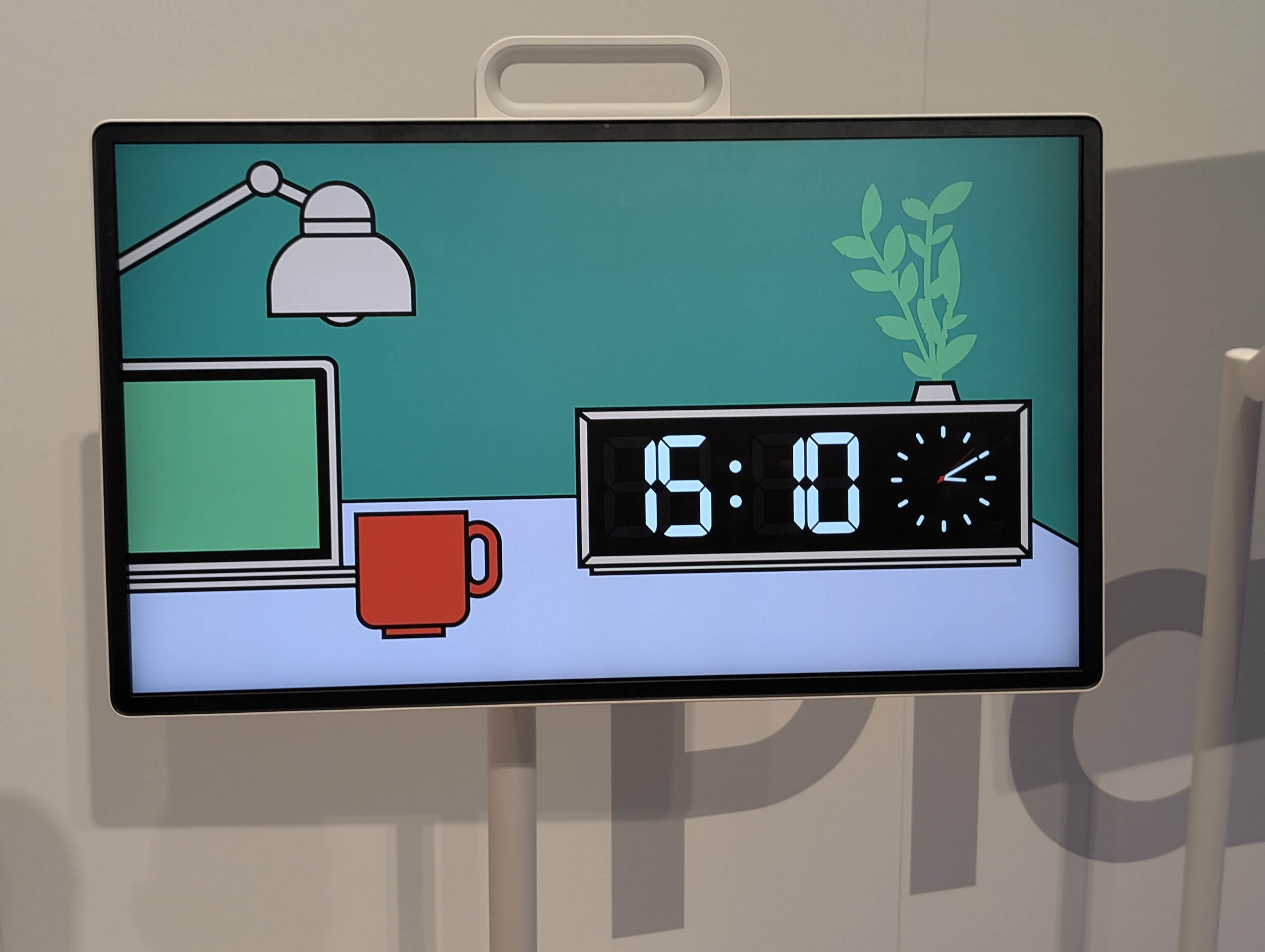 La particularité de ce modèle est que l’écran peut se détacher de son pied d’un geste. Grâce à un système d’attache rapide, on peut le saisir par une poignée intégrée, qui sert également de béquille. Cela transforme le téléviseur en écran autonome, que l’on peut poser sur une table, un bureau ou même au sol.