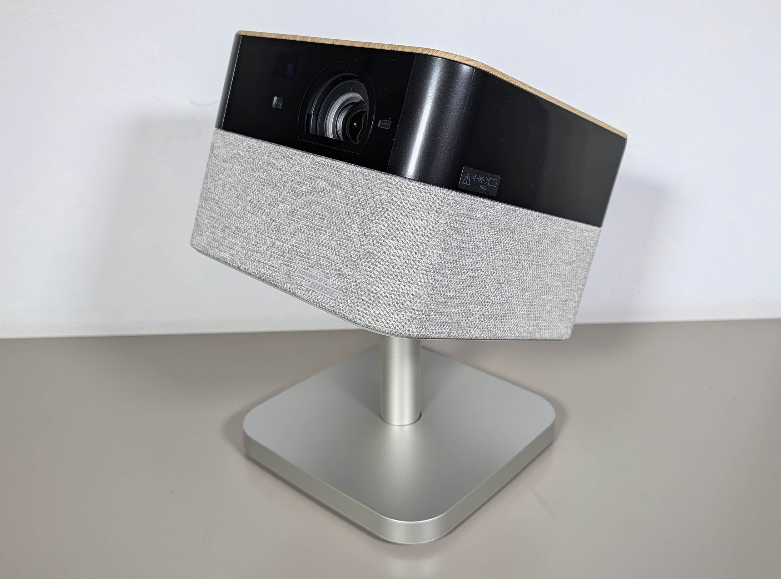 Epson a clairement soigné le design de son vidéoprojecteur. Le modèle EF-72 a une approche esthétique très éloignée des blocs noirs traditionnels et choisit une finition façon chêne sur le dessus et du tissu acoustique pour protéger les haut-parleurs. Il sera facile à dissimuler sur un meuble TV ou une étagère sans attirer l’œil lorsqu’il est en veille.