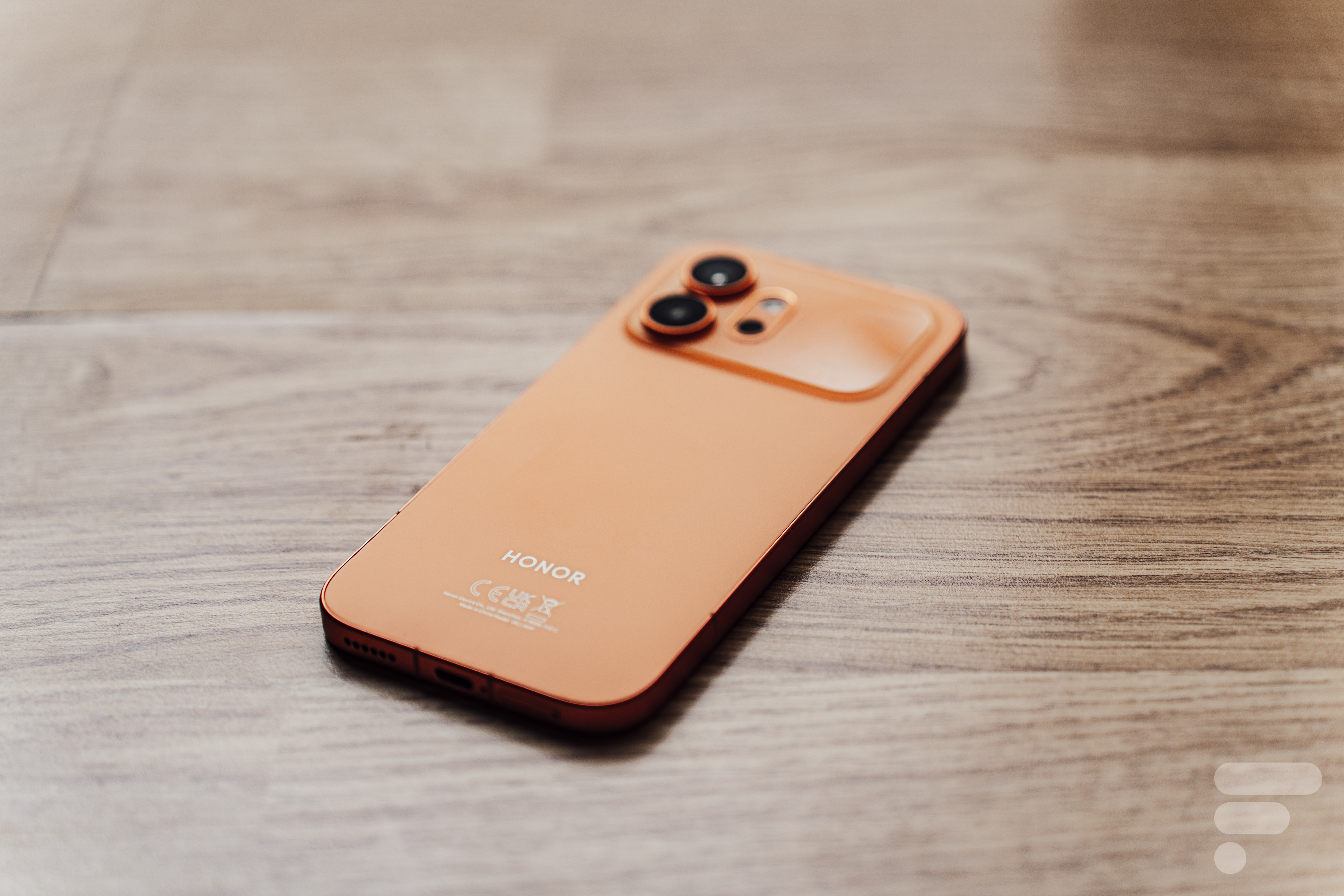 Avec son coloris orange et son bloc photo rectangulaire, le Honor 600 a des airs d’iPhone 17 Pro, mais la comparaison s’arrête ici. Les matériaux sont moins nobles, l’utilisation du plastique trahit son positionnement milieu de gamme. Il reste un beau smartphone, léger (185 g), fin (7,8 mm) mais aussi solide avec sa certification IP69K.