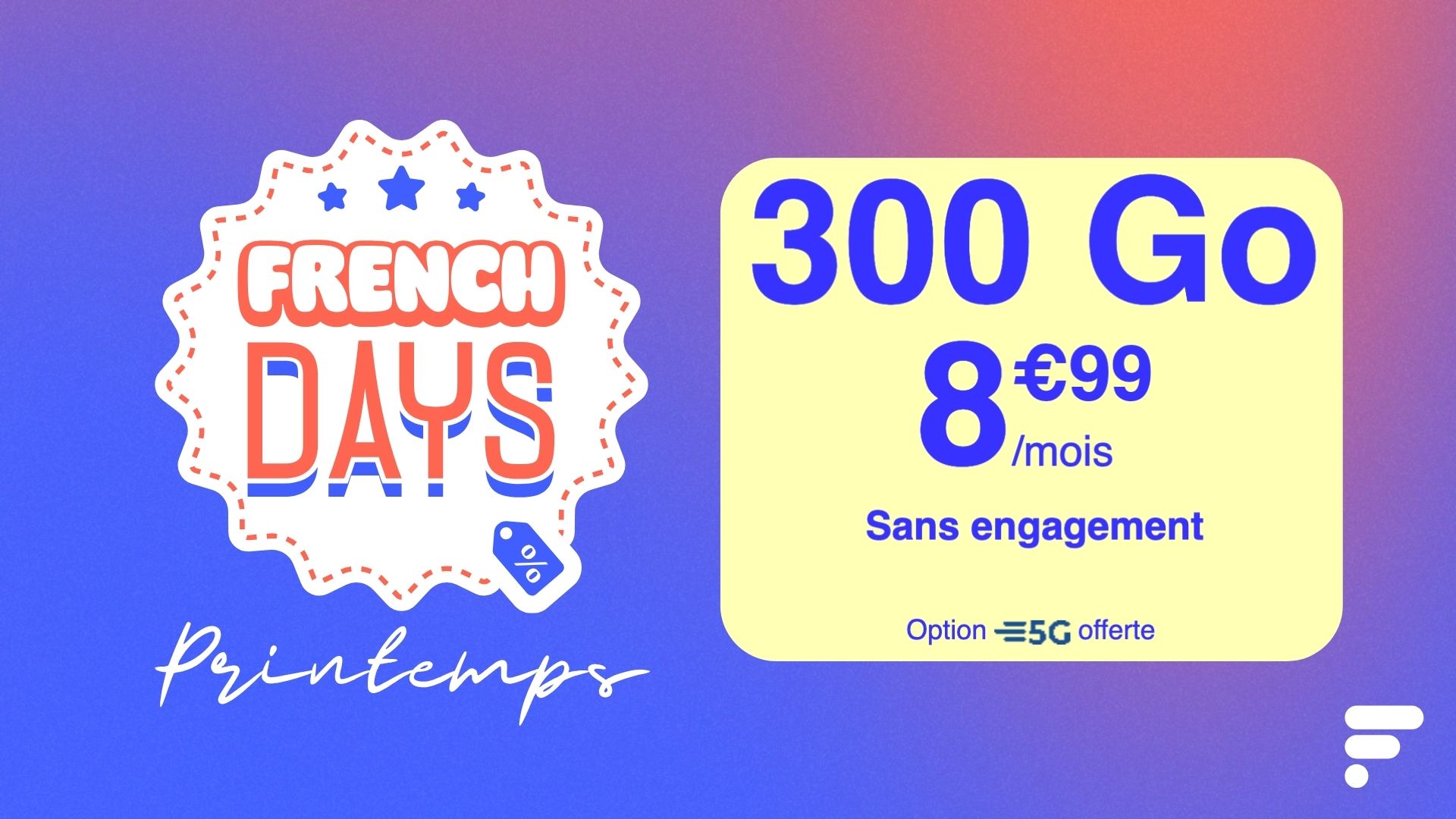 Pendant les French Days, le forfait 5G de 300 Go proposé par Cdiscount mobile est disponible à 8,99 euros par mois. Et c’est bien sûr sans engagement.