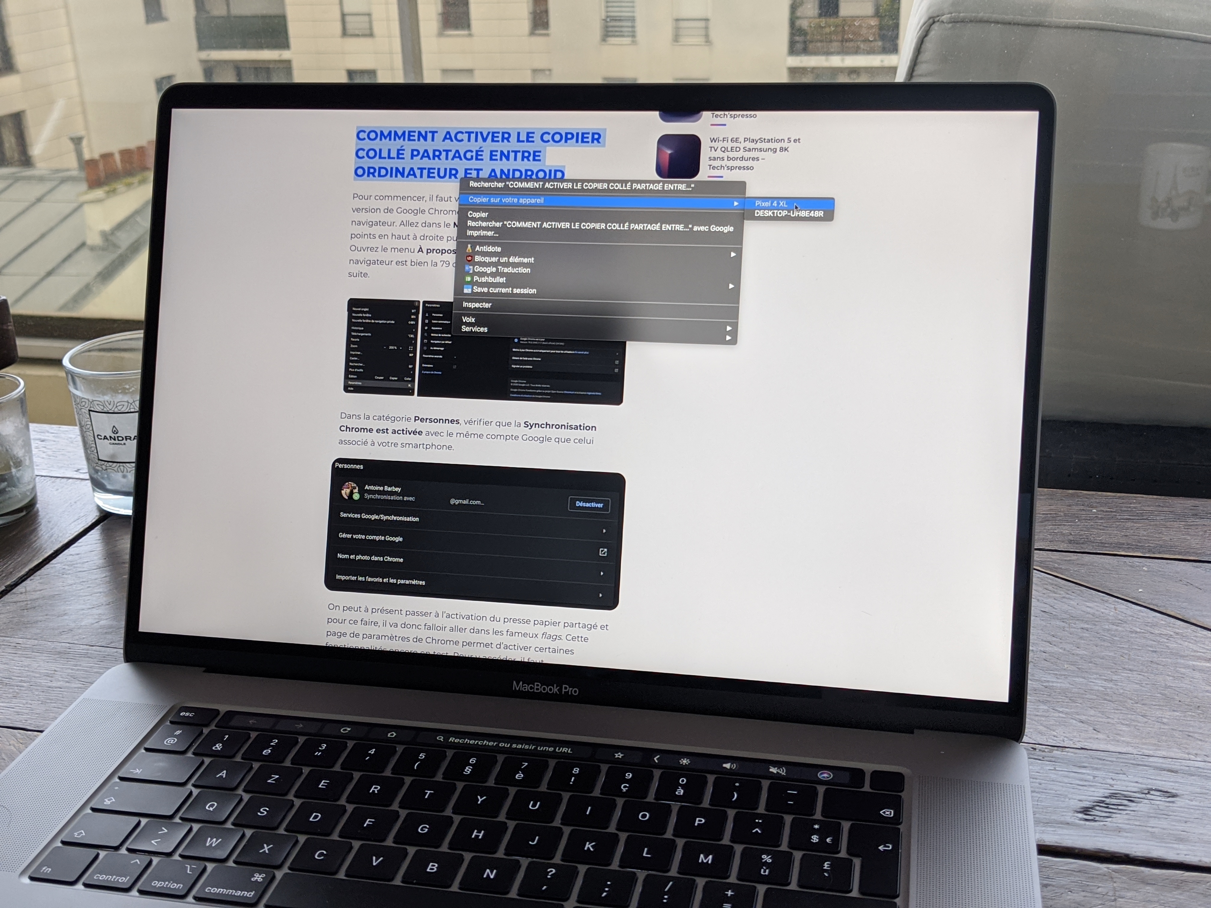 Une fois les flags activés, redémarrez Chrome pour qu’il puisse prendre en compte les changements. Quand Chrome se rouvre, trouvez du texte à copier, sélectionnez-le et faites un clic droit pour faire apparaître le menu contextuel, une nouvelle option y est disponible : Copier sur votre appareil. Choisissez l’appareil sur lequel copier le texte et cliquez sur son nom.