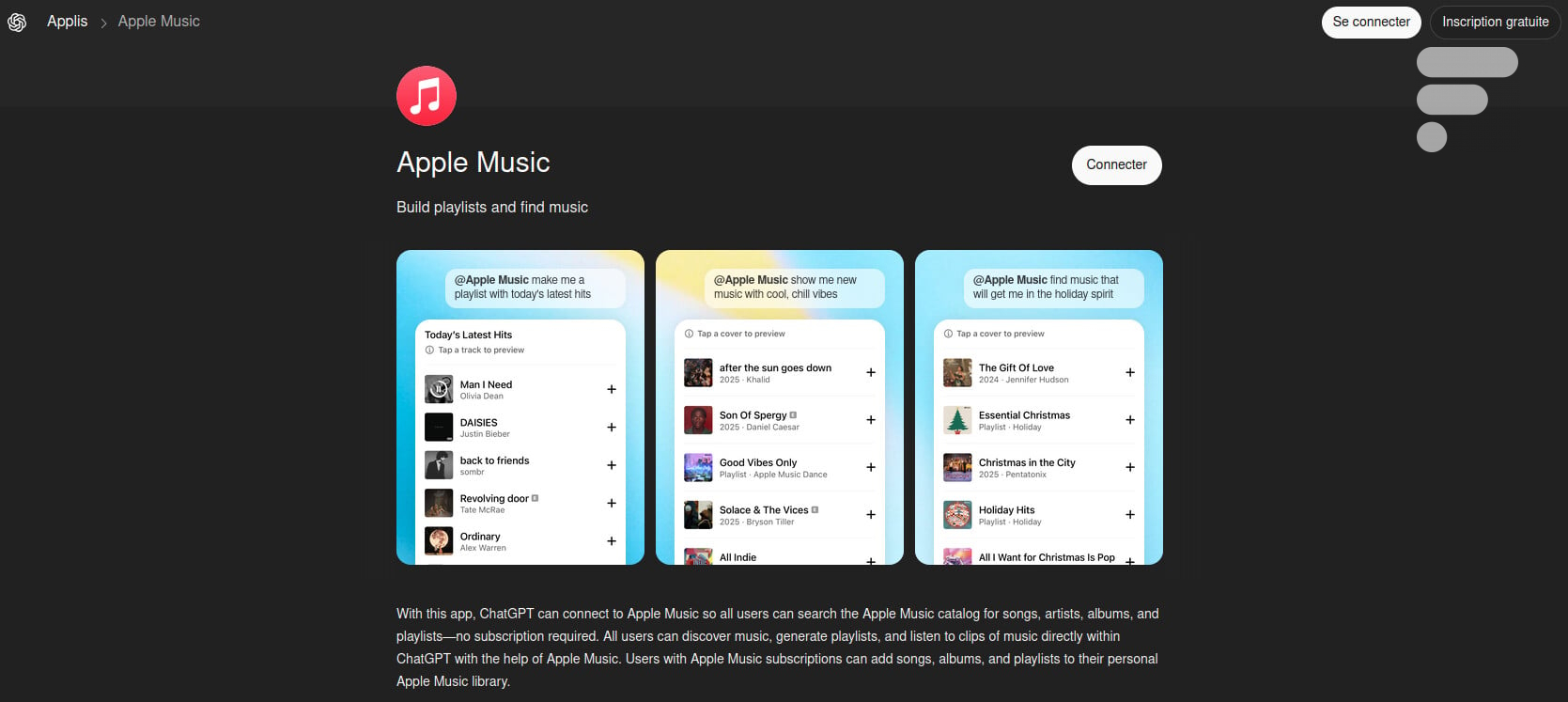 Pour tester l’intégration d’Apple Music dans ChatGPT, il vous faudra un abonnement au service de streaming d’abord et avant tout. Ensuite, il vous suffit de vous rendre sur la page dédiée aux applications de ChatGPT, de choisir le service Apple Music, de vous y connecter et d’autoriser l’accès à votre compte.