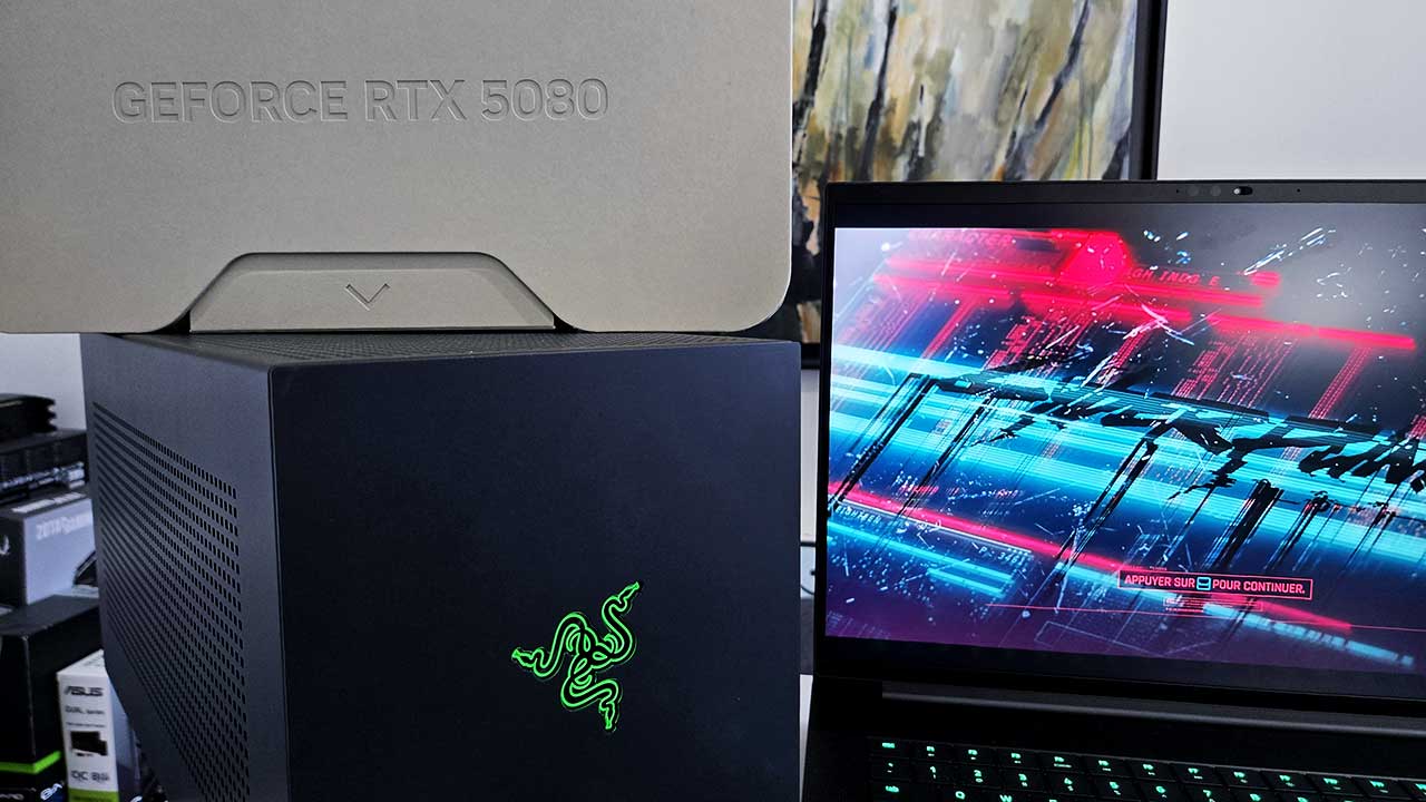 Toutes nos mesures ont été réalisées sans utilisation du DLSS, FSR, XeSS ou autres technologies d’upscaling et de génération de trames. La raison est simple : nous voulons voir les performances brutes de chaque configuration, en nous assurant que la carte graphique tourne toujours à 100%. Il nous faut également saturer au maximum la bande passante du Thunderbolt 5, que nous testons par le biais du nouveau Razer Core X V2 rattaché à un Razer Blade 18 de 2025, rare à être équipé du port adéquat. Par ailleurs, la RTX 5080 Mobile testée vient également de ce PC portable.