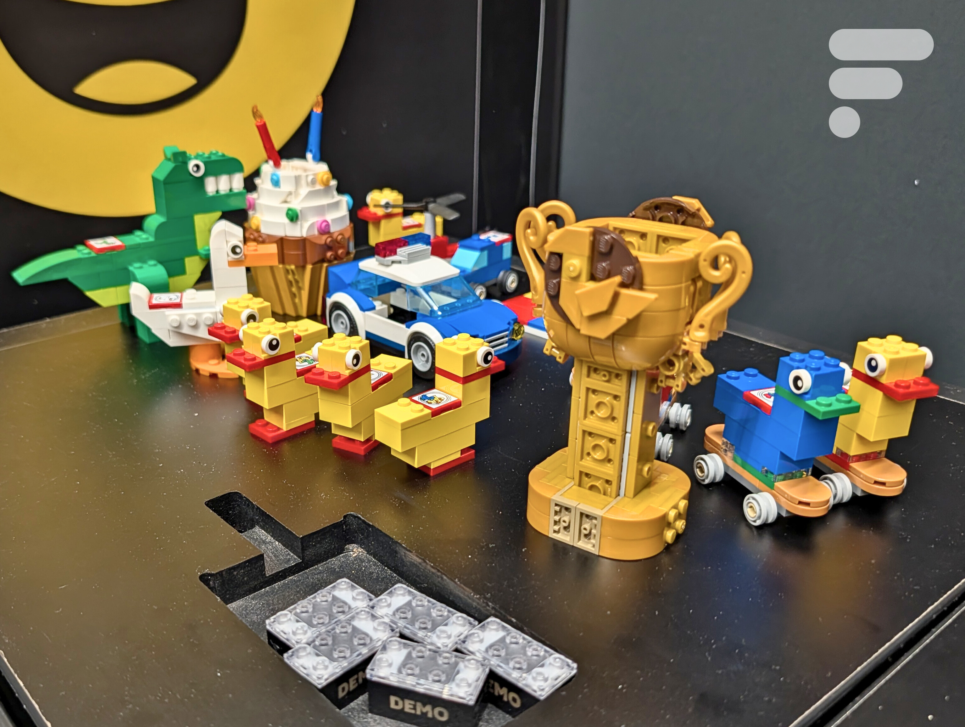 Pêle-mêle, pendant sa démonstration, LEGO a montré une pièce dinosaure capable de fêter son anniversaire en musique et de voir des canards le fêter avec lui. Restons avec les canards avec des canetons qui, selon si leur mère a le dos tourné ou les regarde, changent de comportement. Toujours avec nos amis palmipèdes, on peut créer une sorte de jeu à l’aide d’une coupe. Placez les animaux sur des skateboards et lancez-les. Celui qui se rapproche le plus de la coupe voit sa Smart Brick et celle du trophée s’animer de concert visuellement et auditivement.