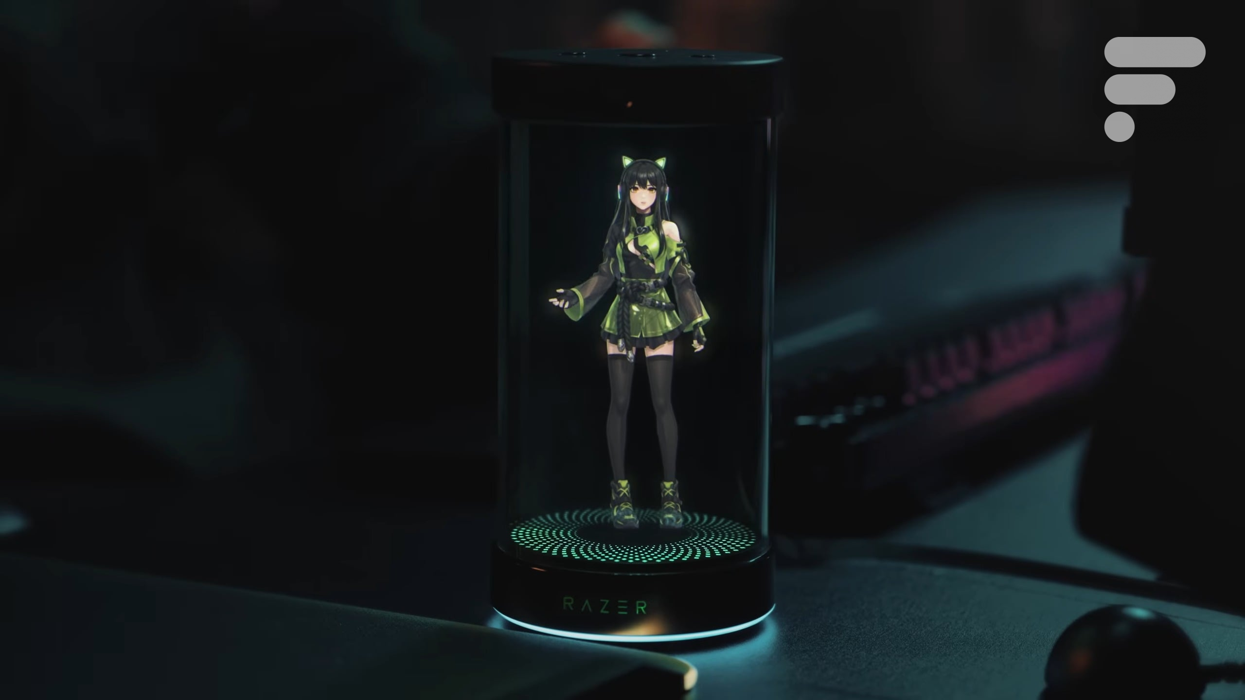 L’idée est simple : un cylindre de 14 cm de hauteur, posé sur votre bureau, abritant un écran transparent de 5,5 pouces holographique. À l’intérieur ? Un avatar animé en 3D, une « Waifu » style anime, un personnage sombre ou même un avatar à l’effigie de stars de l’e-sport comme Faker, qui interagit avec vous.