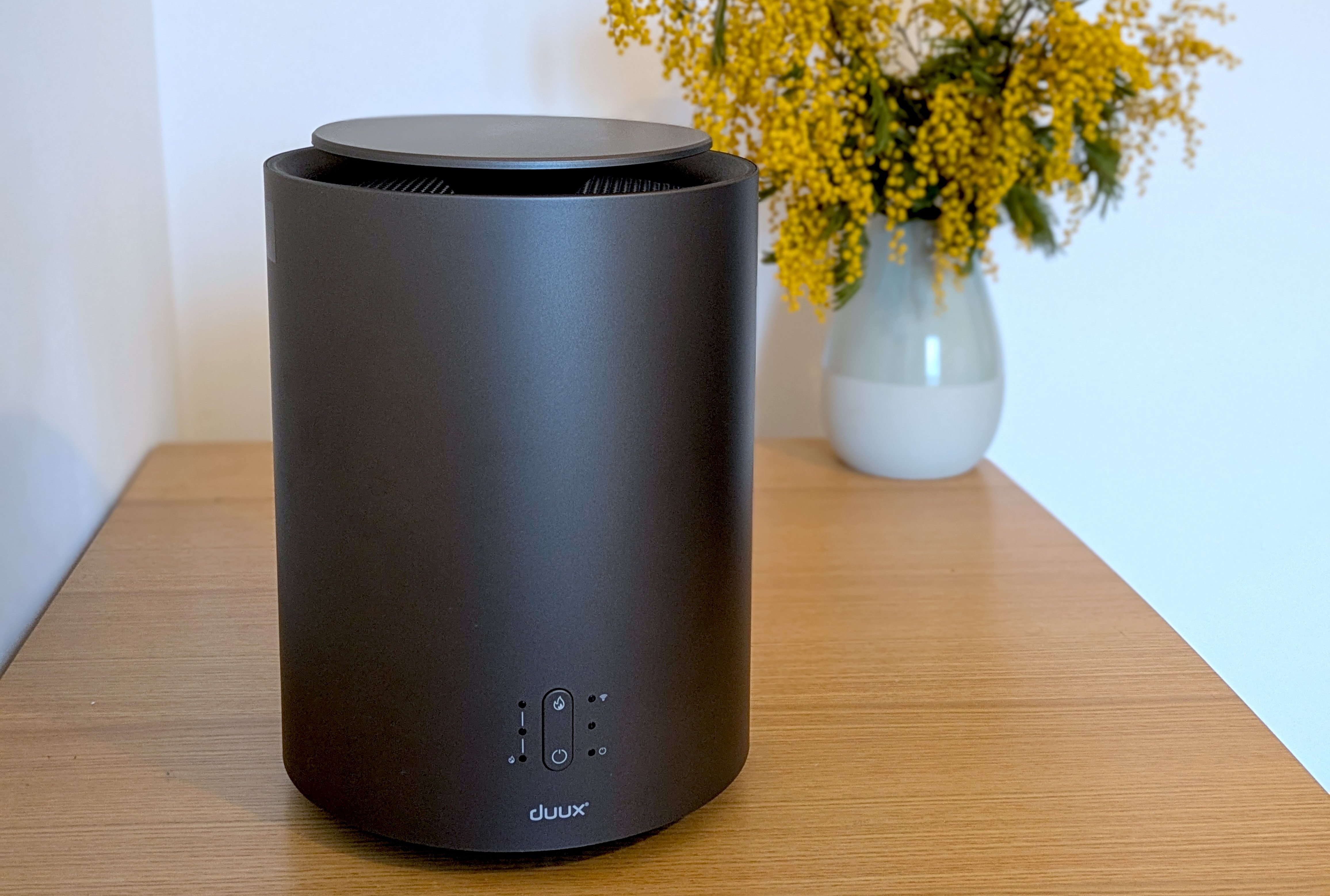 Le radiateur Duux se présente sous la forme d’un cylindre au look épuré, avec une coloration mate et des finitions propres. C’est clairement un de ses avantages : ne pas être trop vilain dans un intérieur. Il est en outre plutôt compact (30 cm de haut), et très léger avec ses 2,25 kg, ce qui fait qu’il se déplace facilement. On regrettera simplement l’absence d’une poignée ou d’une encoche pour s’en saisir. Il est disponible en blanc, noir et gris foncé. Nous avons testé un exemplaire en gris.
