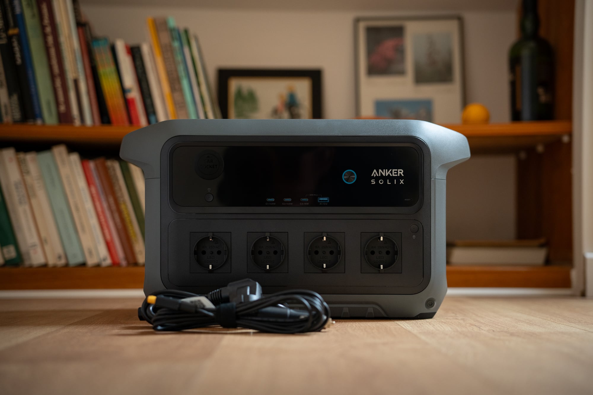 Dès le déballage, la qualité perçue de cette C2000 Gen 2 est excellente. Au-delà de son design, on apprécie l’attention portée aux détails, comme ces scratchs qui permettent de bien ranger les câbles siglés Anker, ou l’ergonomie des poignées de transport. La partie haute de la face avant arbore un aspect piano black, dans lequel se fond l’écran LCD. À l’allumage, ce dernier se distingue de celui de certaines rivales grâce à sa cinématique. Cela ne le rend pas plus lisible, mais participe à l’impression de qualité perçue.