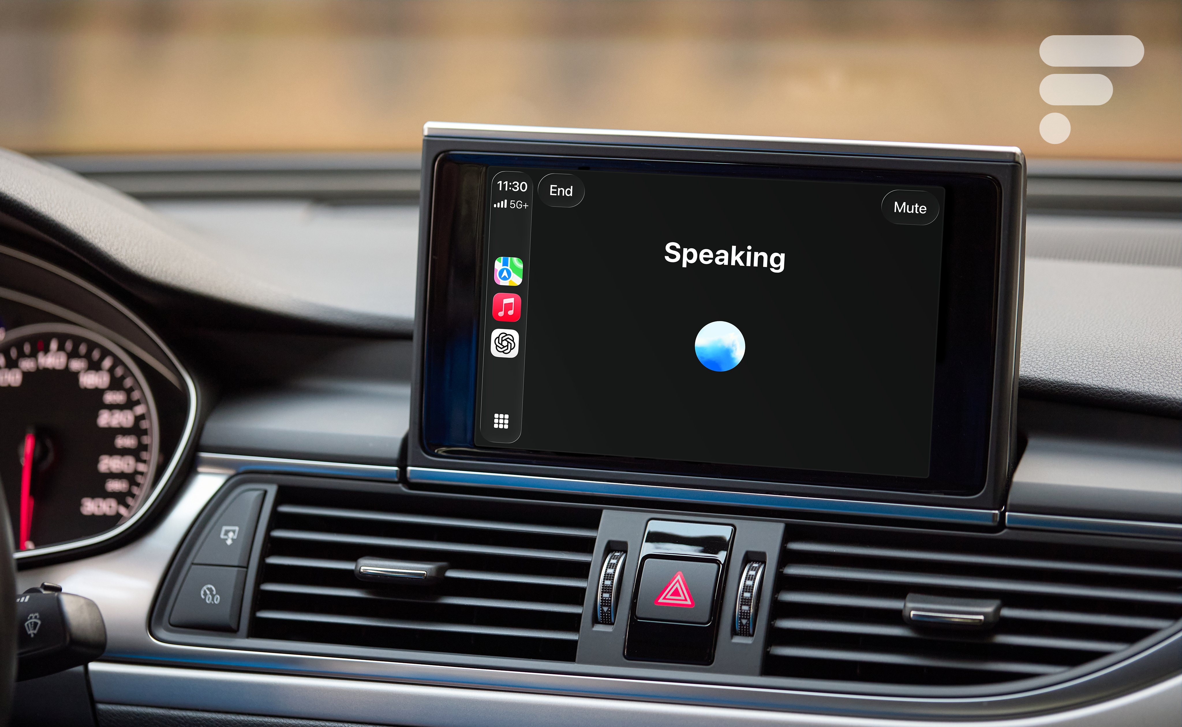 Concrètement, l’écran de CarPlay affiche un design minimaliste avec un bouton pour terminer l’échange, un autre pour couper le micro, et un simple historique des requêtes.