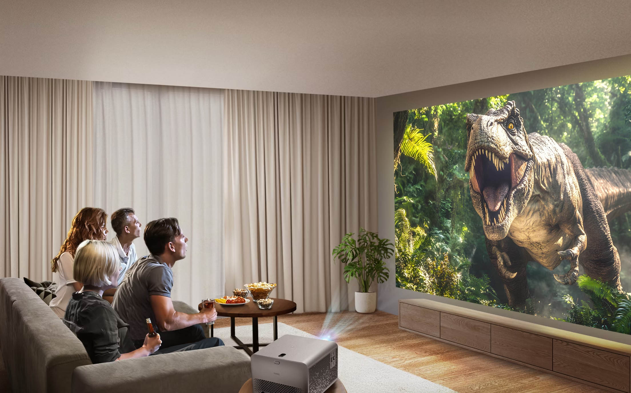 Côté connectivité, on peut compter sur la présence de deux entrées HDMI, dont une est compatible HDMI 2.1, ainsi qu’un port USB-C de 30W permettant d’alimenter et de transmettre le signal depuis un ordinateur portable. Il y a aussi une sortie audio mini-jack 3,5 mm. La section audio repose sur un système stéréo de 16W (2 x 8W), avec possibilité d’utiliser les vidéoprojecteurs comme enceinte Bluetooth. Notez également la prise Trigger 12V pour s’interfacer avec un écran motorisé, le cas échéant. Ils sont compatibles Wi-Fi 6 et Bluetooth 5.2 avec prise en charge des fonctions Google ChromeCast et Apple AirPlay.
