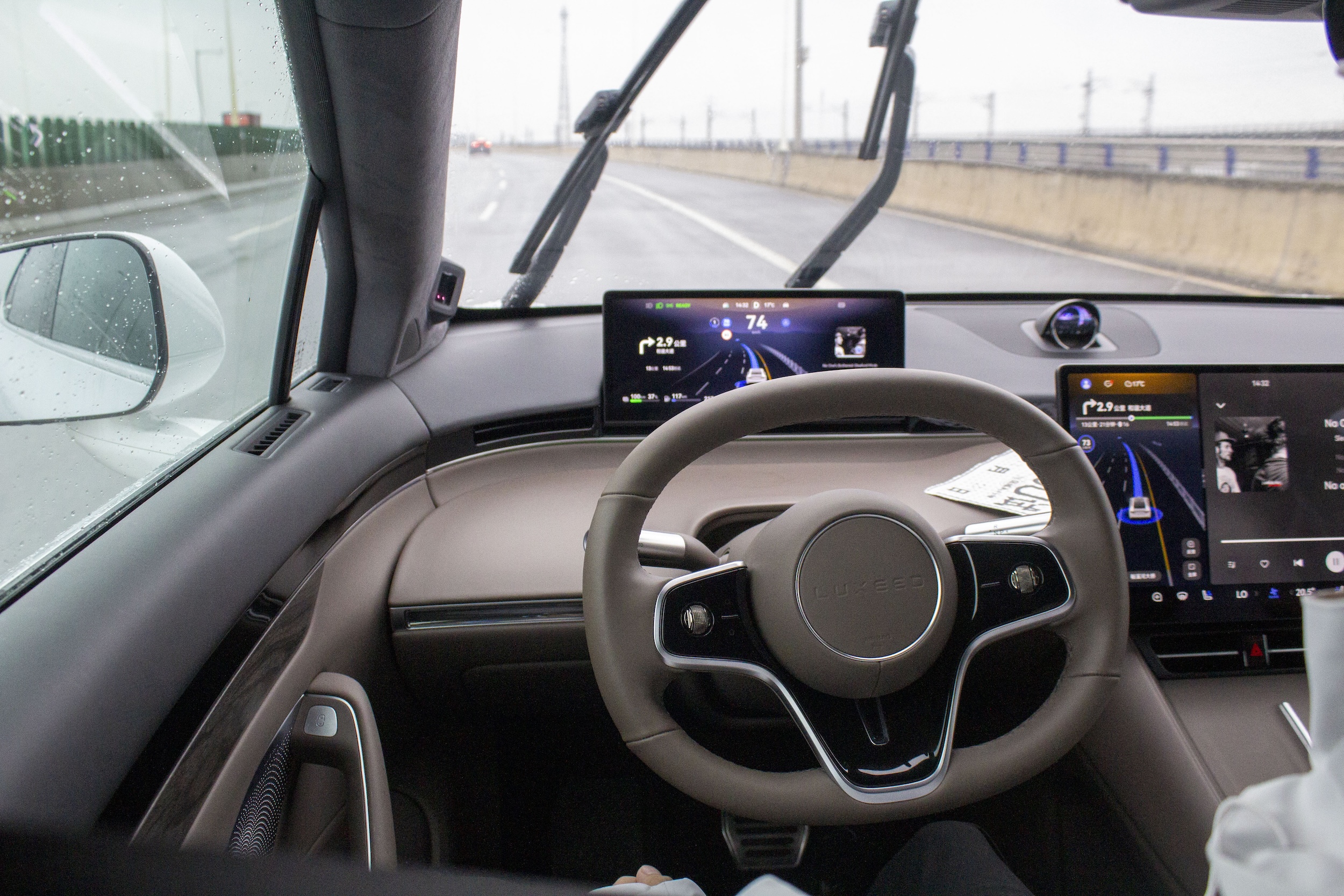 Notre trajet nous a fait prendre les immenses artères (désertes) de Wuhu, puis des 2×2 voies dans sa banlieue et la campagne alentour. Chose intéressante : dès l’activation du NCA, des lumières bleu turquoise s’allument de chaque côté de la voiture, signalant aux autres utilisateurs que la Luxeed roule d’elle-même. Pour autant, le conducteur doit maintenir ses mains sur le volant.