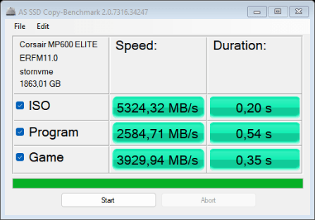 Niveau débits, ce MP600 Elite atteint les promesses faites par Corsair, avec une lecture séquentielle pouvant dépasser les 7000 Mo/s alors que l’écriture séquentielle gravitera toujours autour des 6500 Mo/s sur CrystalDiskMark. Sur ATTO Benchmark, test généralement plus sévère, les chiffres sont aussi très bons avec une lecture séquentielle proche des 6,5 Go/s ainsi que plus de 5 Go/s en écriture.