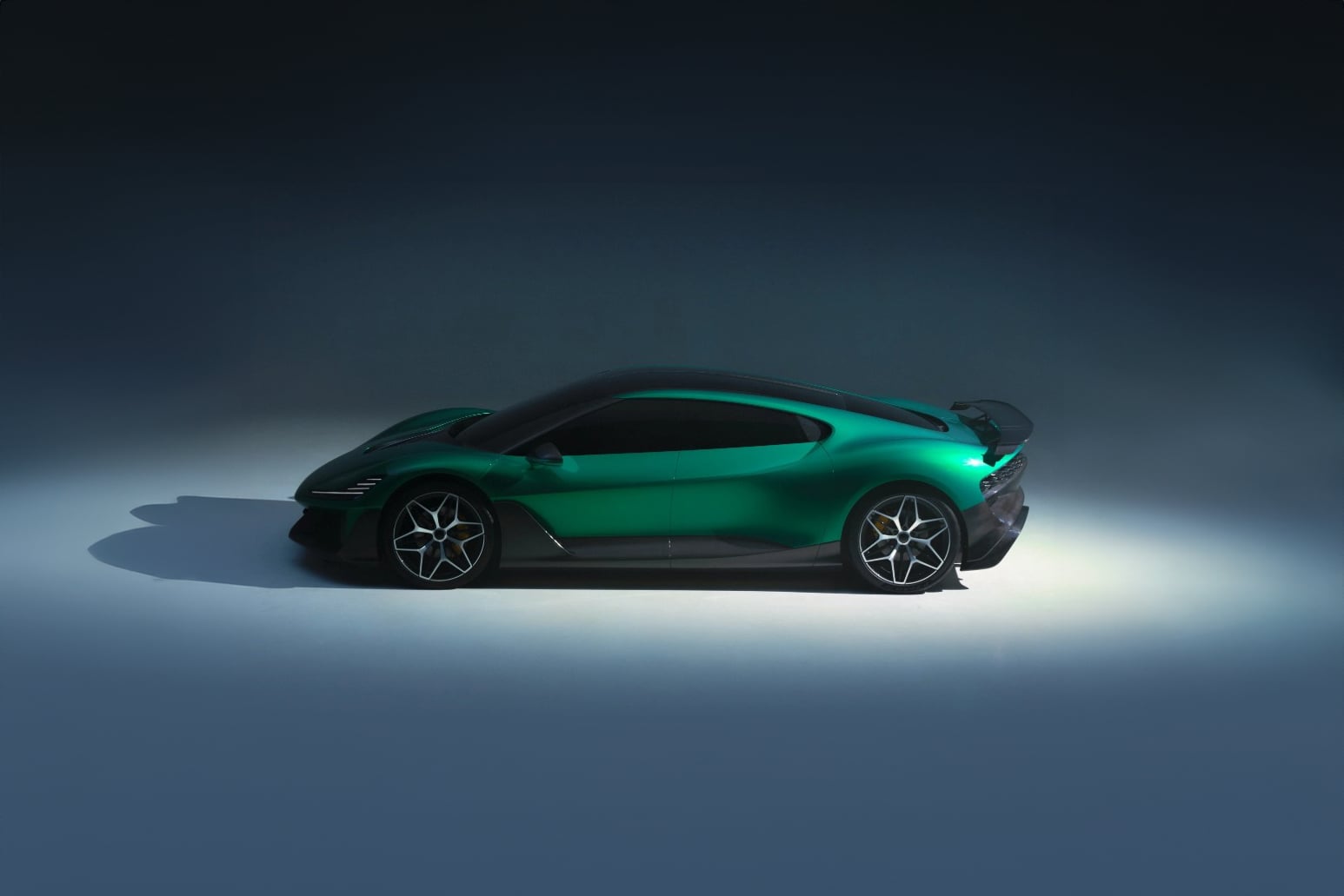 De profil, la voiture affiche des flancs plus épurés, tandis que l’on retrouve un large aileron et des jupes latérales proéminentes. A l’arrière, la supercar a le droit à un imposant diffuseur, afin d’améliorer l’appui à haute vitesse. Elle s’offre également quatre portes, même si les places arrière devraient être très étroites. On note que la ligne de toit est quant à elle particulièrement inclinée, afin d’améliorer l’aéro. Enfin, de jolis feux à LED en 3D complètent l’ensemble à l’arrière. La face avant demeure quant à elle encore mystérieuse.