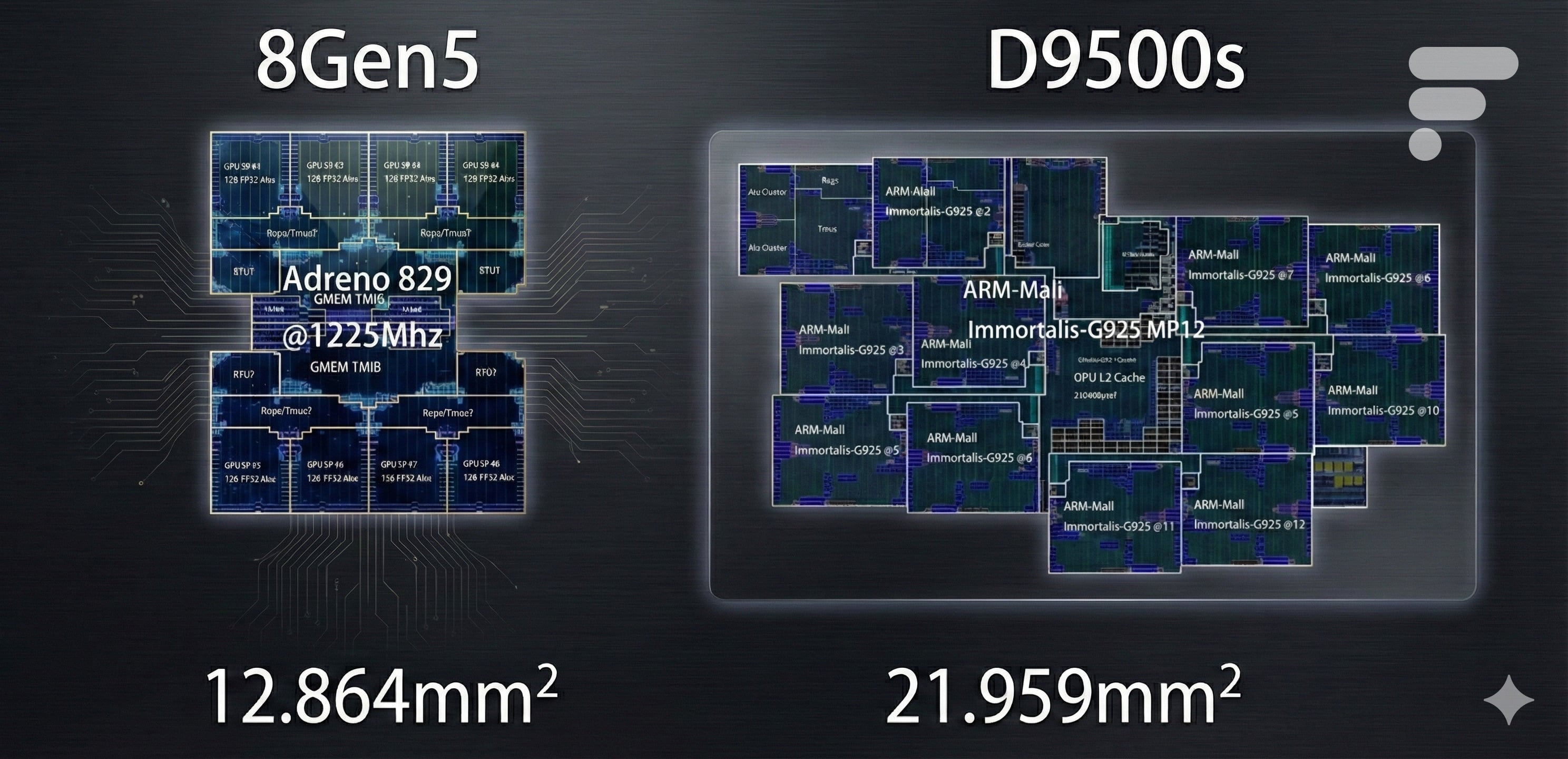 En face, MediaTek a clairement changé de stratégie. Avec le Dimensity 9500s, ils adoptent une approche « château fort ». Ils empilent 12 cœurs graphiques (MP12) et, surtout, ils leur donnent de la place pour respirer. Une surface plus grande permet théoriquement d’étaler la dissipation thermique et d’intégrer plus d’unités de calcul brut.