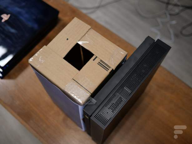 Même constat avec la PS4 Pro, qui fait elle aussi 30 cm de large, mais seulement 5,5 cm de haut et 33 cm de profondeur quand elle est posée à l’horizontale.