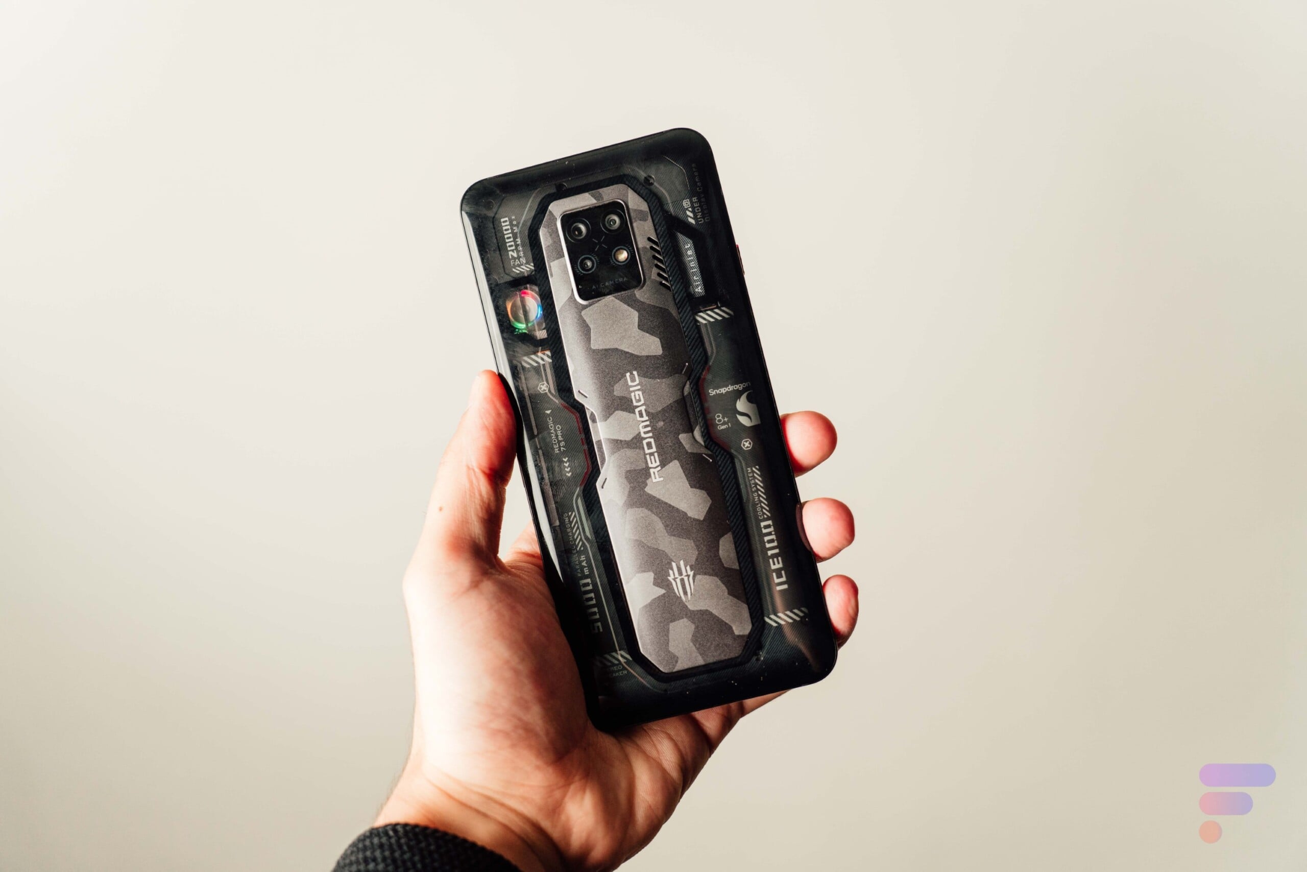 Ce n’est pas tout à fait ce design qui choque en prenant en main le Red Magic 7S Pro. Ce n’est pas même son ventilateur actif. Deux éléments ressortent véritablement. Tout d’abord, que la partie centrale en mode camouflage à son dos est vraiment faite d’un plastique très cheap. Et aussi que le téléphone est terriblement lourd. À 240 grammes sur la balance, il me fait en main l’effet d’un produit plus lourd encore que mon Galaxy Z Fold 3, pourtant à 275 grammes replié. Une grosse plaque de verre et de métal, qui paraît tout à fait solide, mais n’est pas si plaisante à utiliser à une main lorsqu’elle repose sur le petit doigt.
