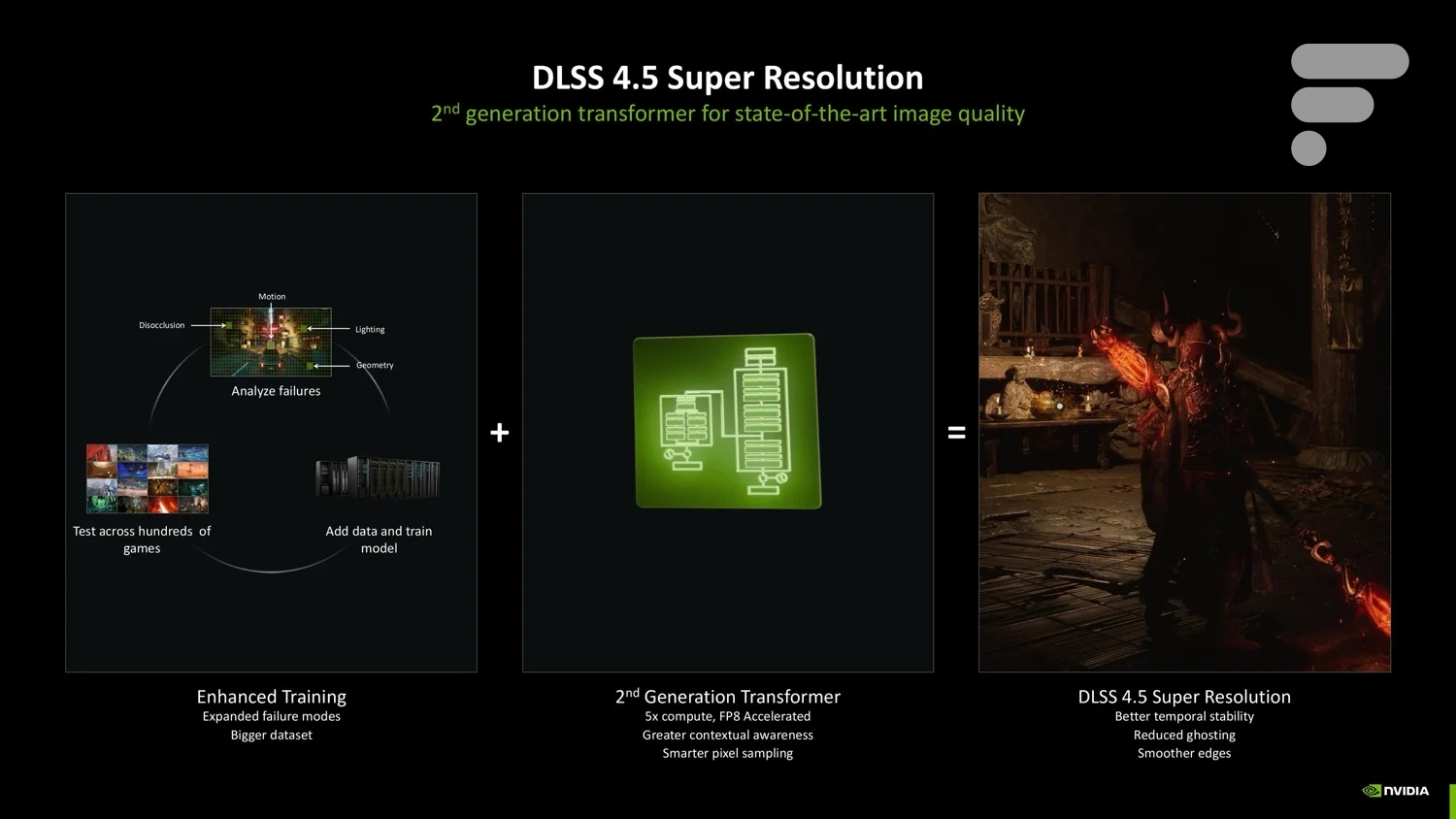 Nvidia a profité du CES pour déployer une nouvelle mise à jour de sa technologie DLSS en introduisant notamment une nouvelle version de son modèle Transformer pour la partie upscaling et une Multi-Frame Generation qui génère jusqu’à 6 images.