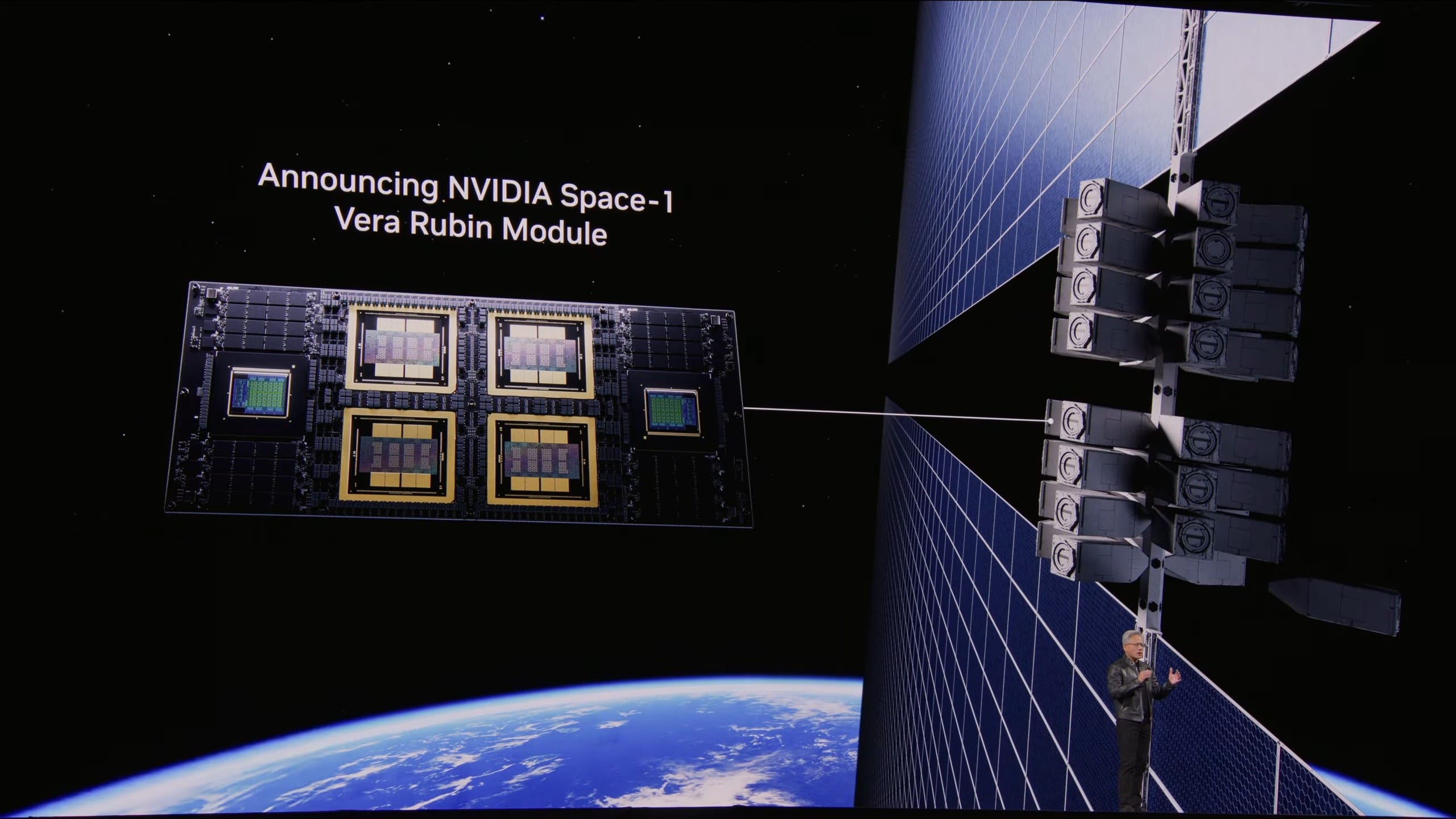 D’ailleurs, petit interlude Vera Rubin. Il s’agit d’une plateforme complète, avec 4 GPU Rubin (50 PFLOPS NVFP4, 288 Go HBM4, 336 milliards transistors), un CPU Vera (88 cœurs Arm, co-désigné avec Rubin) ainsi qu’une interconnexion NVLink de 3,6 TB/s par GPU, le tout dans le module Space-1.