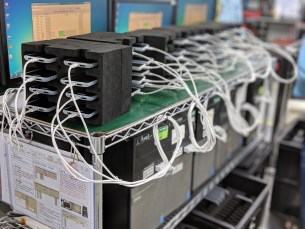 Les haut-parleurs et les écouteurs USB Type-C sont testés. L’employé ci-dessous est un des seuls à pouvoir utiliser des écouteurs : il branche toutes les 15 secondes un nouveau smartphone pour tester ce dernier.