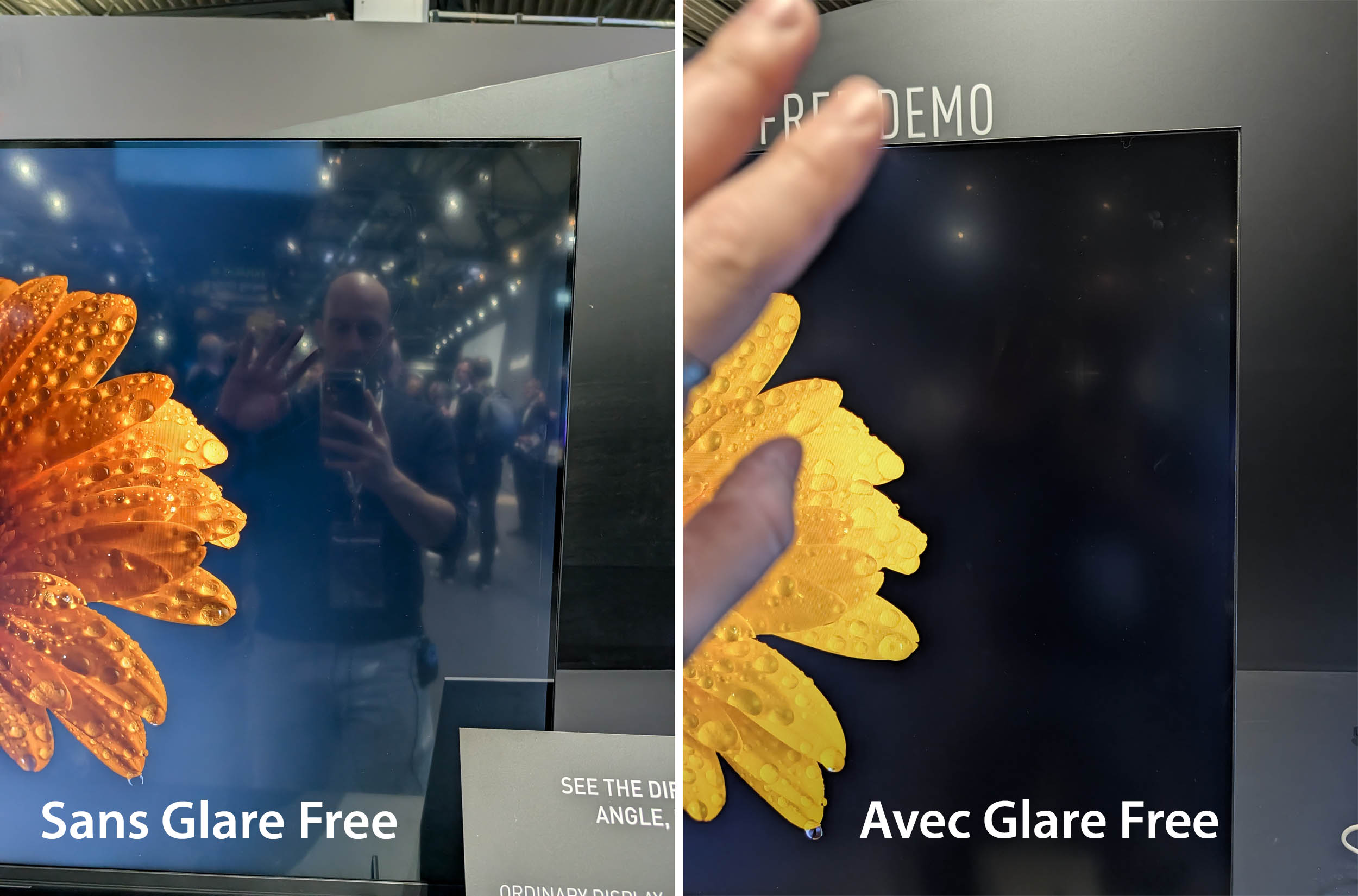 C’est, en somme, un compromis entre la vivacité d’une dalle brillante et le confort d’une dalle mate, offrant un rendu organique qui rappelle presque l’impression sur papier glacé, mais avec toute la puissance lumineuse du Mini LED. D’après ce que nous avons pu voir sur place, les reflets sont effectivement gommés, la luminosité semble préservée et on conserve bien les noirs.
