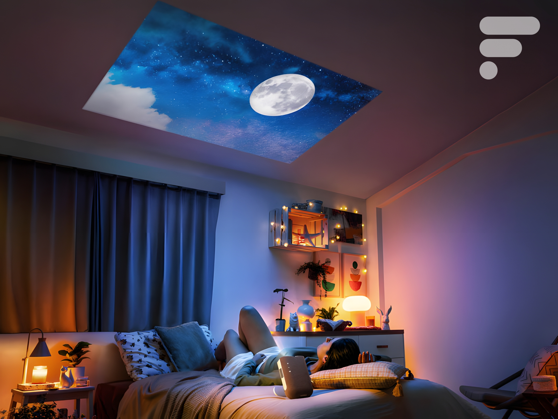 Côté installation, il intègre des fonctions automatiques de correction de l’image et un support qui permet de l’incliner à l’envi pour une projection sur le mur, au plafond, au sol et autant de surfaces possibles.