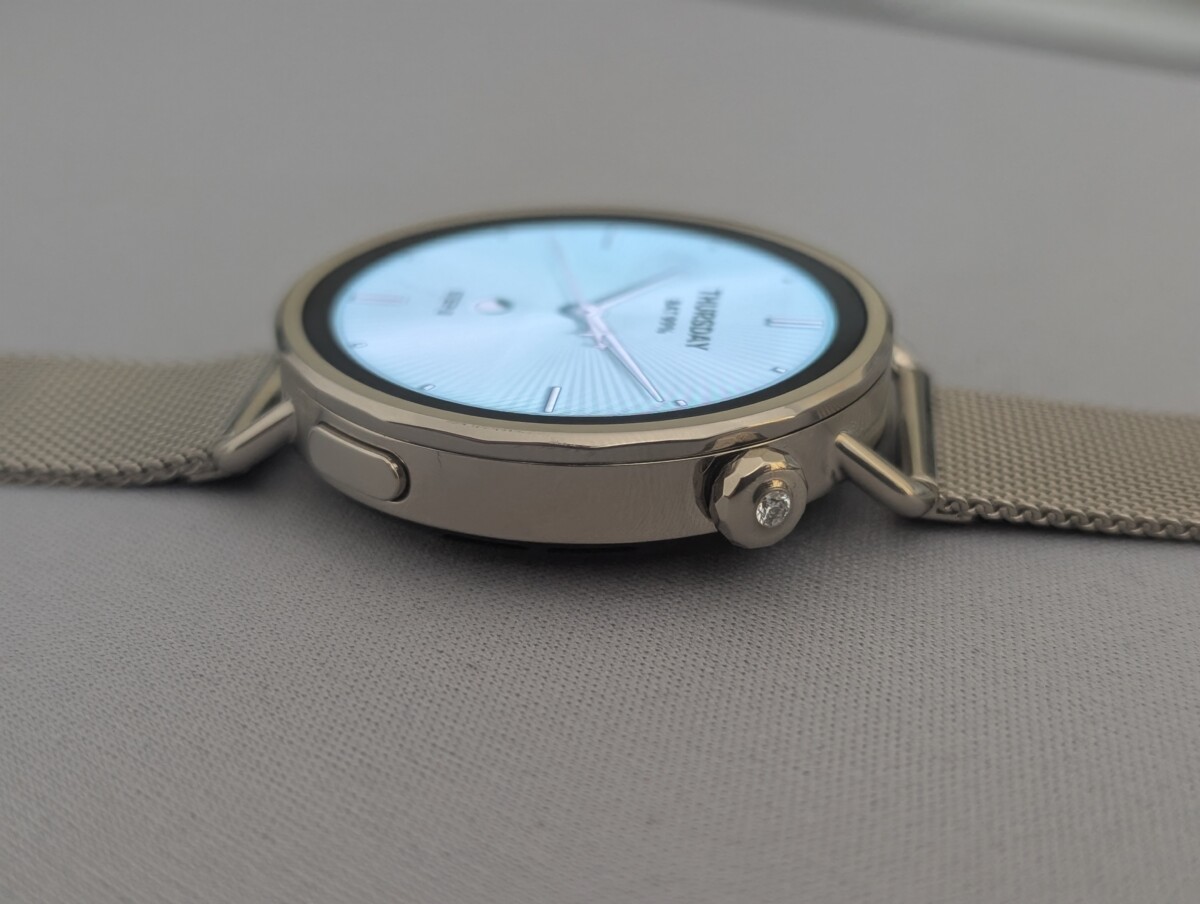 Avec ses 41 mm de diamètre, 9,5 mm d’Ă©paisseur et pour un poids (hors bracelet) de 32 g, il s’agit d’une montre connectĂ©e pensĂ©e pour la discrĂ©tion. Une discrĂ©tion relative, puisque le modèle que le constructeur nous a prĂŞtĂ© pour notre test est intitulĂ© « Diamond Edition ».