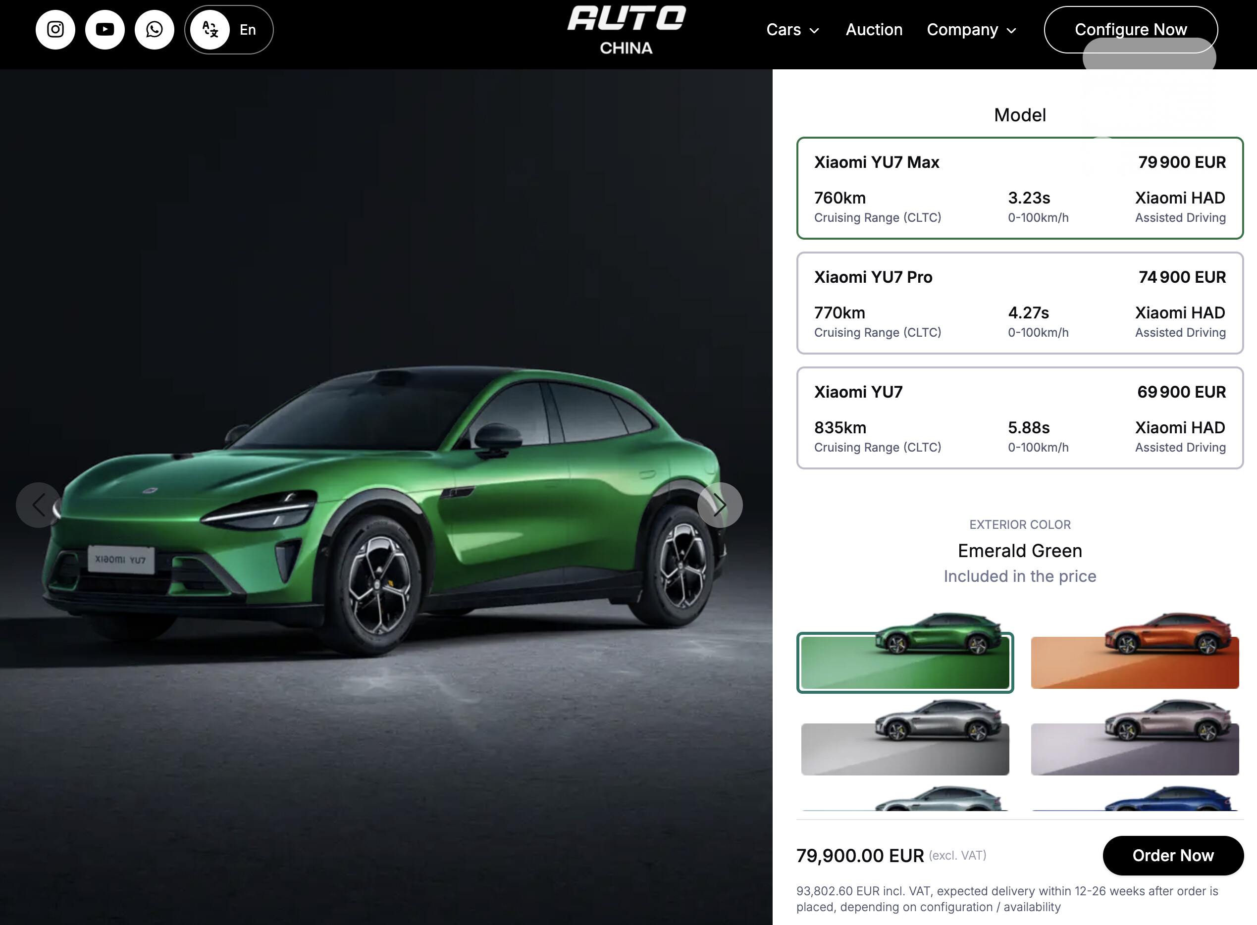 L’entreprise allemande auto-china.com n’a pas attendu que Xiaomi se décide et propose déjà plusieurs unités du YU7, du SU7 Max et même de l’impressionnante version Ultra de 1 500 chevaux.