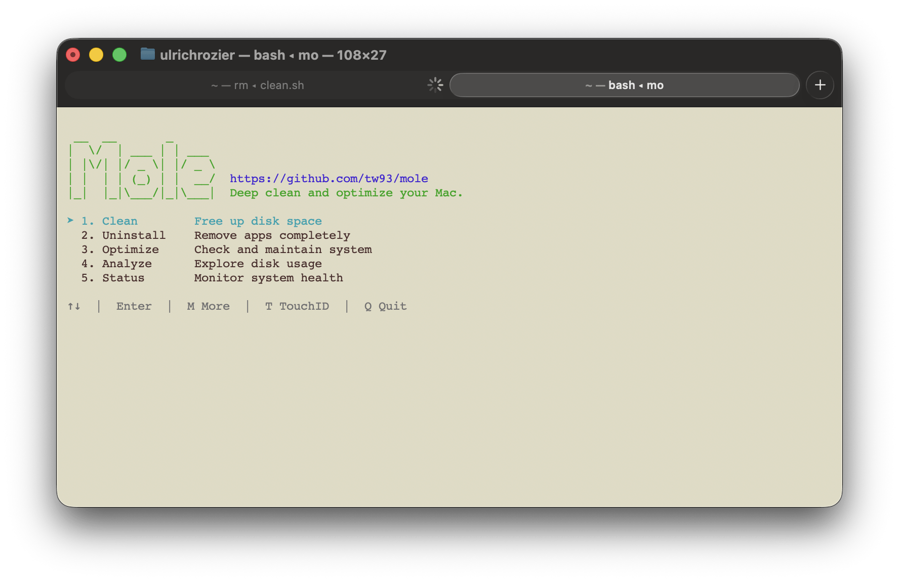 Regardez les options : nettoyage en profondeur (mo clean), désinstallateur intelligent (mo uninstall), analyseur de disque (mo analyze) et même un dashboard de santé en temps réel (mo status).