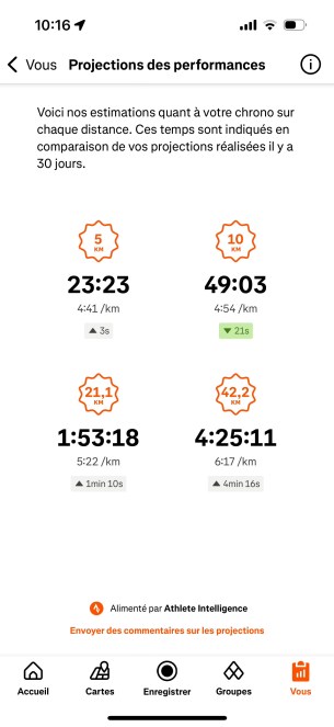 Concrètement, en se rendant dans l’onglet « vous » de l’application mobile, puis dans « progrès », vous verrez apparaître une nouvelle « projection des performances ». À l’instar des prédicteurs de course que l’on retrouve chez Garmin, Coros ou Huawei, l’idée est d’estimer, en fonction de vos entraînements récents et de vos temps passés, le temps que vous mettriez à courir une course de 5 km, de 10 km, un semi-marathon ou un marathon.