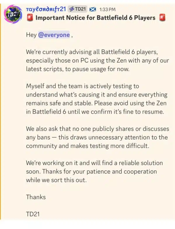En coulisse, les développeurs de scripts sur le serveur de Cronus incitent les utilisateurs à ne plus en faire l’usage pour le moment, le temps d’enquêter sur leur dysfonctionnement dans Battlefield 6. Pire encore : ils sont même incités à ne pas relayer leur bannissement pour éviter de mettre en avant le fonctionnement de ces scripts.