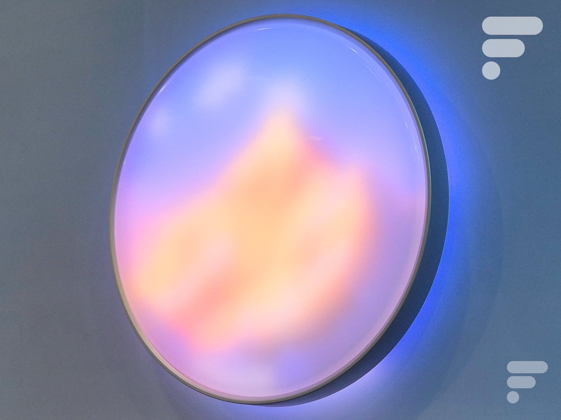 Au-delà de sa finesse, c’est la densité de ses LED qui change la donne. Avec une matrice de 616 pixels, ce plafonnier ne se contente pas de diffuser des couleurs, il se transforme en un véritable écran circulaire au-dessus de vos têtes. Cette résolution inédite pour un luminaire permet d’afficher des motifs d’une précision étonnante, comme des paysages de montagnes stylisés ou des aurores boréales dynamiques, donnant l’impression d’avoir une œuvre d’art numérique ou une fenêtre ouverte sur un autre monde directement au plafond.