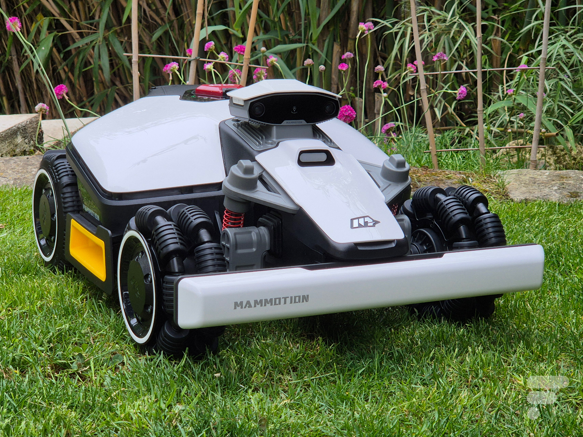 De plus, la tondeuse dispose d’une certification IPX6, autorisant un nettoyage au jet d’eau sans risque. Côté sécurité, un pare-chocs mécanique est présent à l’avant pour détecter les obstacles bas que la caméra pourrait ne pas voir. Celle-ci se fixe sur le dessus du robot, lui offrant une vue assez élevée et précise.