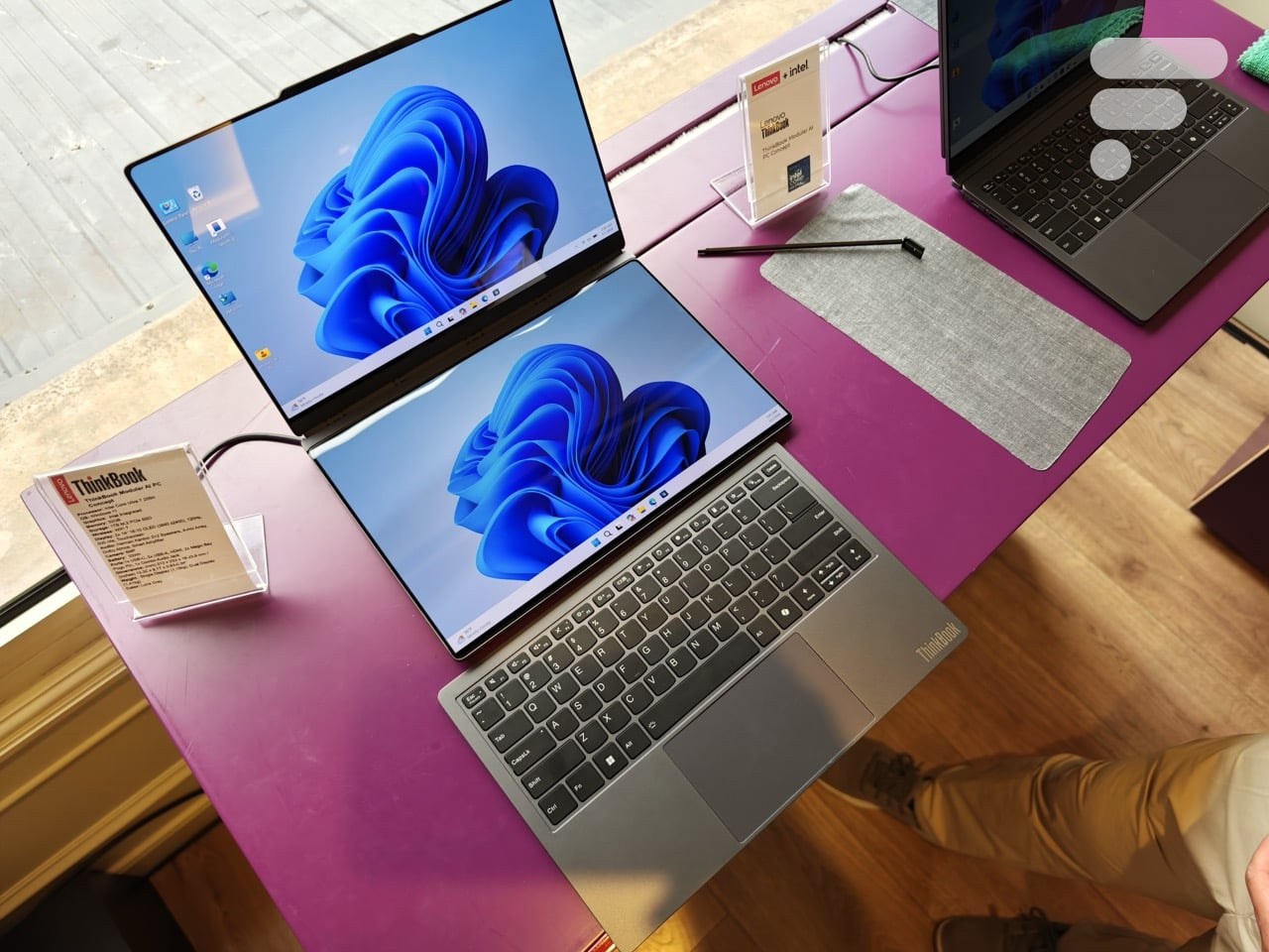 La configuration la plus impressionnante est sans doute l’écran déporté sur le côté. Grâce à un kickstand intégré, ce second moniteur se transforme en écran de voyage parfaitement aligné avec l’écran principal, en mode portrait ou paysage.