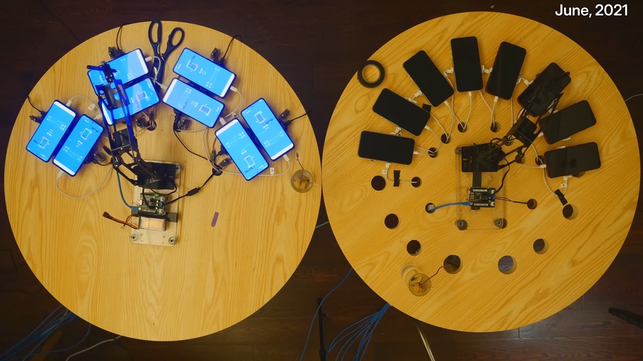 HTX Studio n’a pas fait les choses à moitié. Six iPhone 12 et six Vivo iQOO 7 (un modèle Android capable d’encaisser 120 watts de charge rapide) ont été répartis en trois groupes distincts.