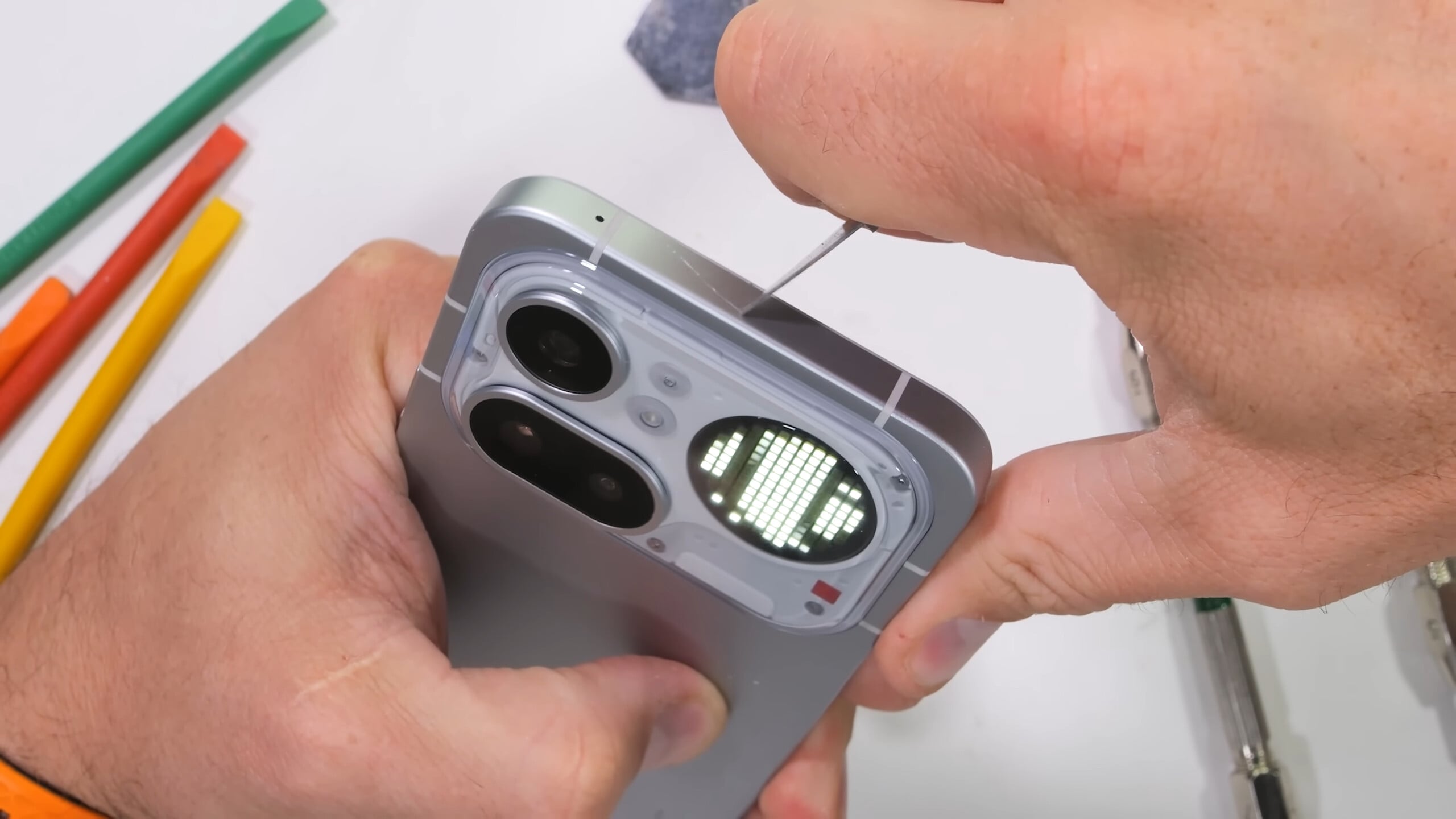 La zone recouvrant les LEDs Glyph est en plastique, un matériau qui ne se brise pas en cas de chute, mais qui est bien plus sensible aux rayures du quotidien que le verre.