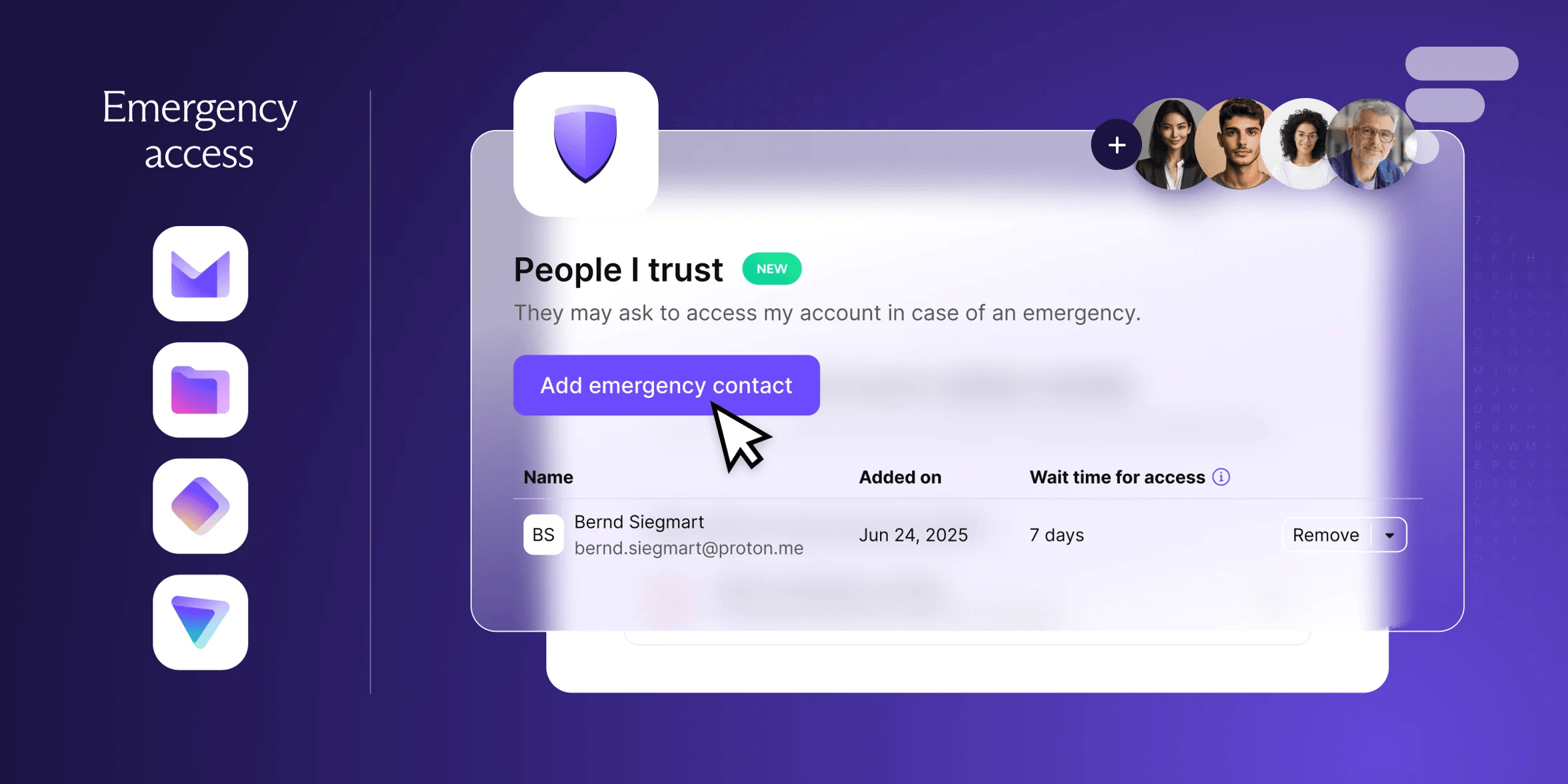 L’idée est de ne perdre aucune de vos données « si vous ne pouvez pas accéder à votre compte en raison d’une maladie ou d’un décès », détaille la firme. En nommant un contact d’urgence, ce dernier sera capable d’accéder à vos mails, données Drive ou vos mots de passe Proton Wallet en cas de besoin. La période d’inactivité nécessaire à l’accès au compte peut aller de 1 à 30 jours. Où il est aussi possible d’ouvrir l’accès automatiquement après une demande du contact d’urgence.