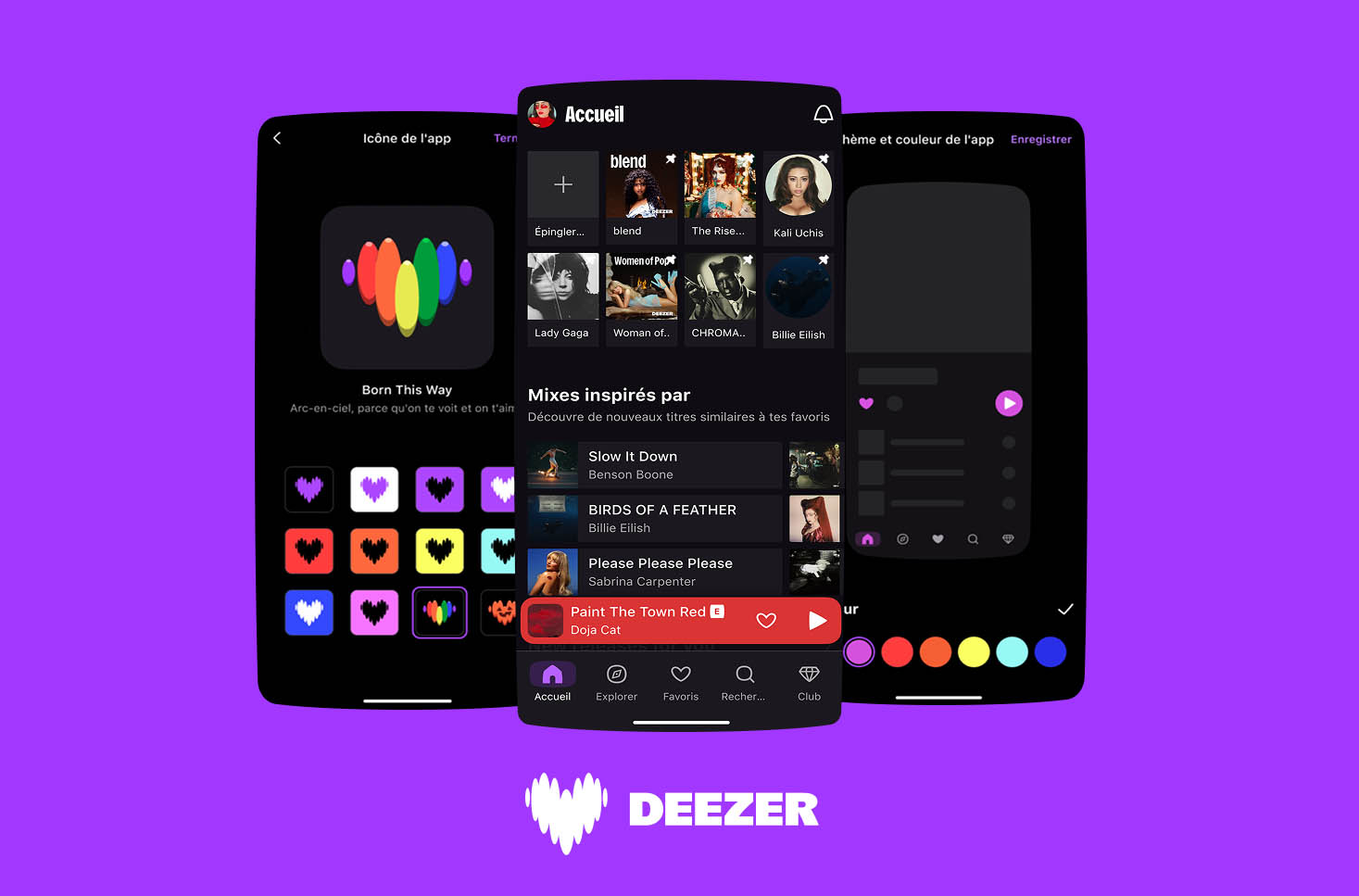 La première nouvelle fonctionnalité de Deezer, c’est le fait d’avoir à disposition des options inédites de personnalisation de l’interface et de l’apparence de l’application. Celle-ci propose désormais une palette variée de thèmes personnalisables qui permettent à chacun de modifier l’apparence et le style de l’application à volonté. Sur smartphone comme sur ordinateur, vous pouvez donc sélectionner un thème mode clair ou sombre, et changer la couleur dominante de l’interface en fonction de vos préférences. En outre, Deezer introduit des styles créatifs pour l’icône de l’application, disponible sur iOS et Android, ainsi qu’un éditeur de stickers pour accompagner les playlists, bien utile pour rendre chaque liste de lecture vraiment unique.