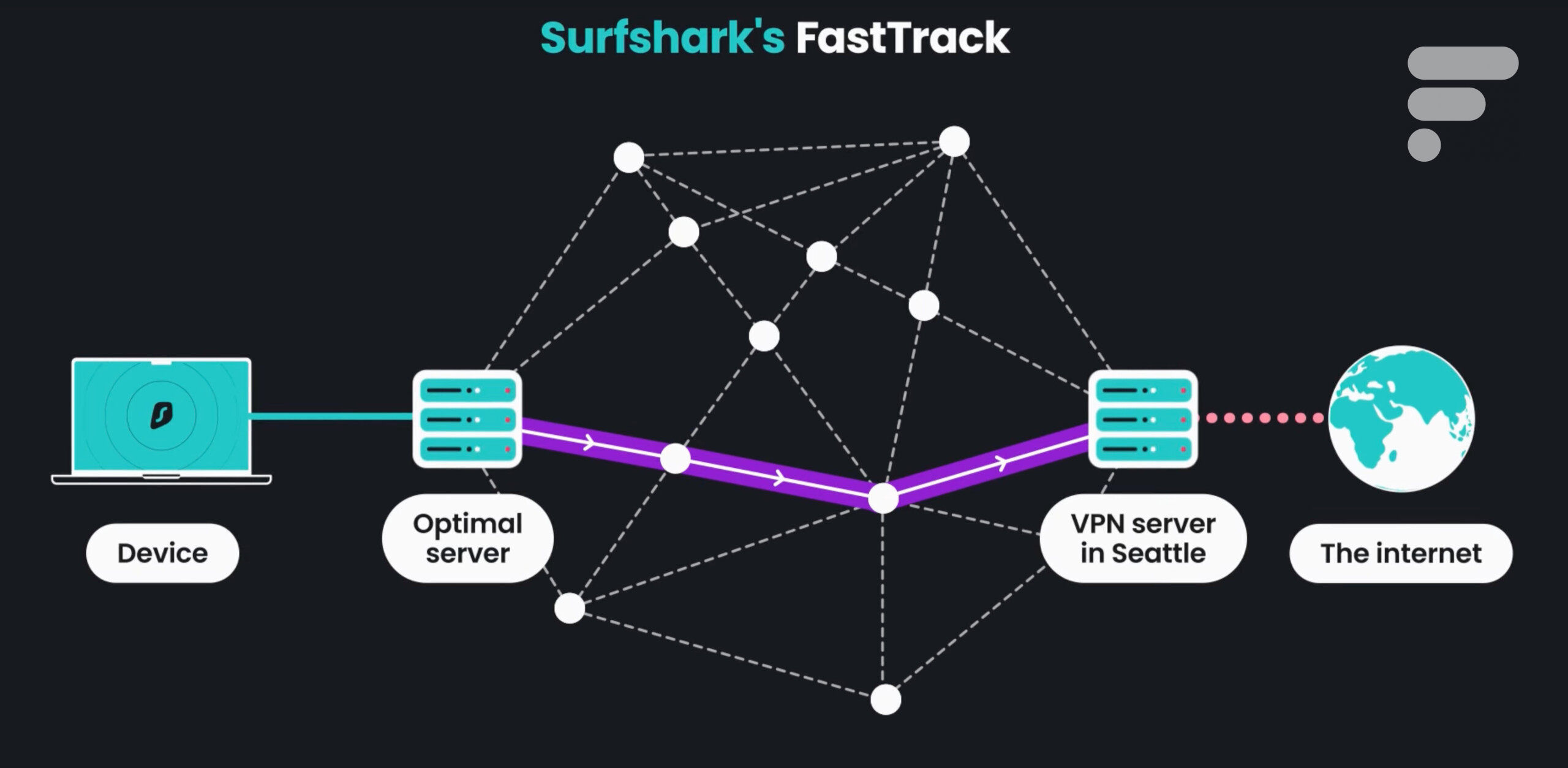FastTrack est en quelque sorte le Waze du VPN. En activant cette fonctionnalité, vos données sont assurées de prendre le chemin le plus rapide jusqu’au serveur VPN que vous avez sélectionné, même s’il n’est pas le plus direct.