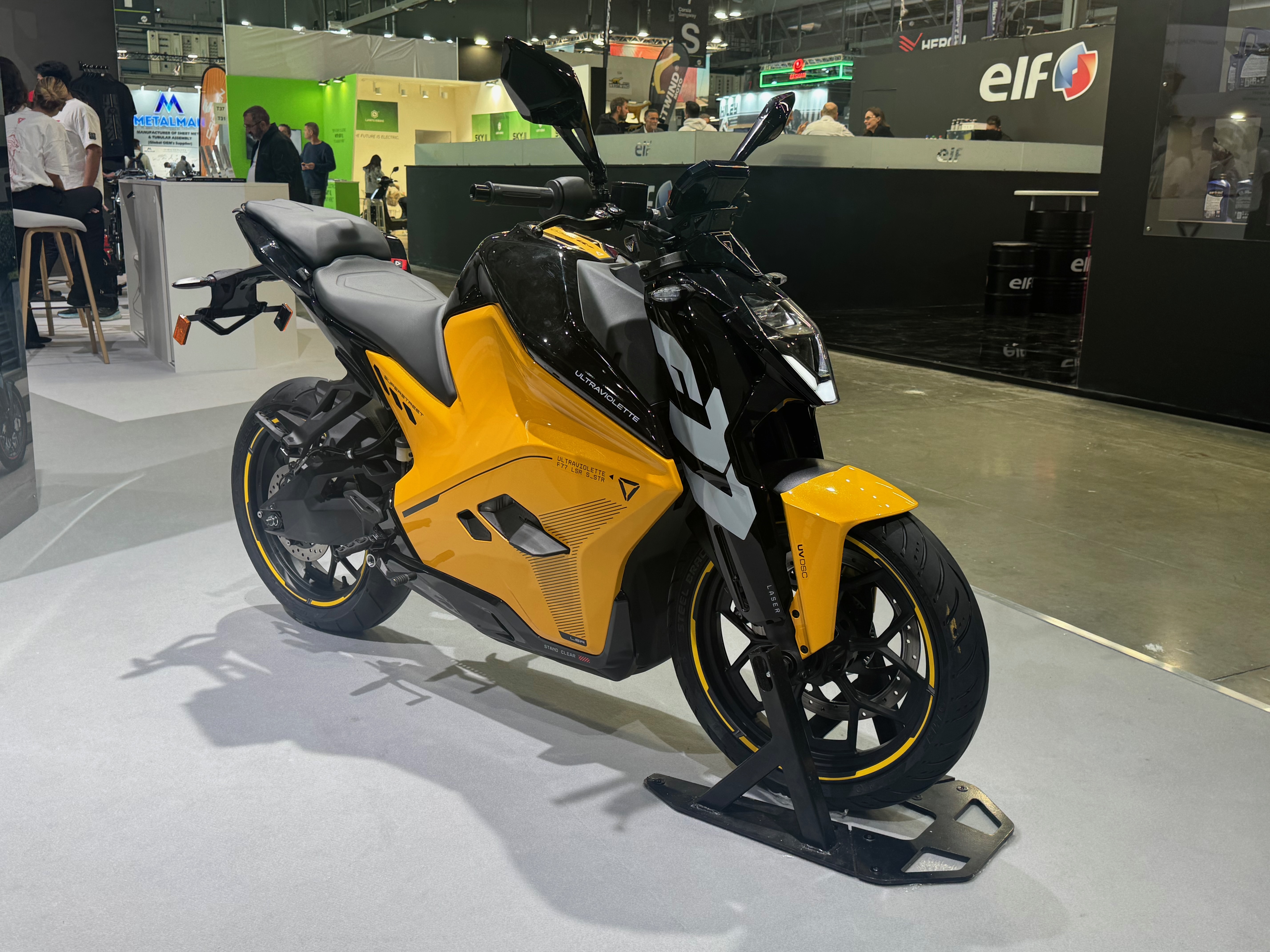 Autre vedette du stand, le Tesseract marque les débuts d’Ultraviolette sur le marché des scooters. Positionné face au BMW CE-04, ce maxi-scooter mêle design anguleux et haut niveau d’équipement : radar et dashcam intégrés, miroirs “Omnisense” avec alertes visuelles, tableau TFT 7 pouces, et 34 L de rangement sous la selle.