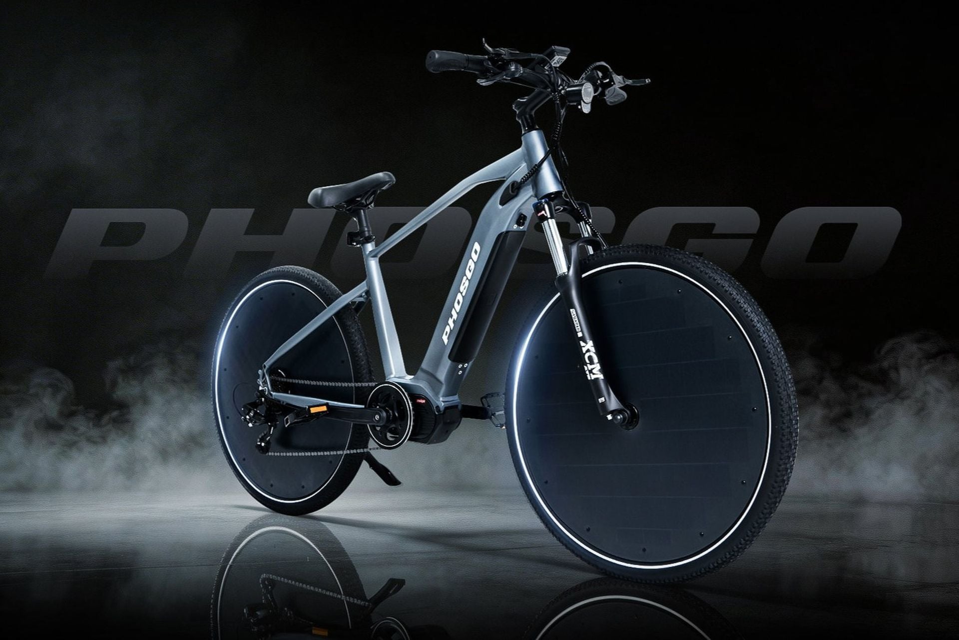 VTC électrique à fourche suspendue, d’apparence classique, le Phosgo possède 4 panneaux solaires, 2 de chaque côté des roues. Ils offrent une puissance de charge totale de 200 W (4 x 50 W), grâce à un rendement de cellules de 26%.