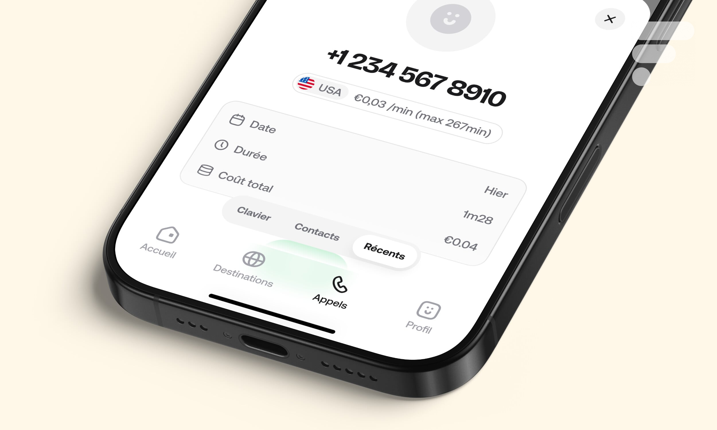Il est possible de passer un appel n’importe où à l’international, un peu comme Skype, et de visualiser son coût juste après avoir composé le numéro. Le prix à la minute ainsi que la durée disponible sont indiqués, payables en Koins (la monnaie de l’application). Kolet annonce des tarifs à partir de 0,03 €/min pour les États-Unis.